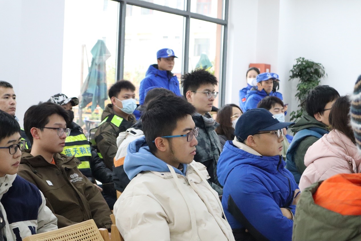 分享会伊始,武汉蓝天救援队医疗组组长曹阳向大家介绍了队伍的职责,包括综合救援、社会服务、防疫救灾、赛事保障和社会培训等。曹阳告诉在座师生,在上述职责中,武汉蓝天救援队的主要活动并非紧急的综合救援,而是日常的社会培训,毕竟“没有救援才是好事,没有救援说明没有人员伤亡”。