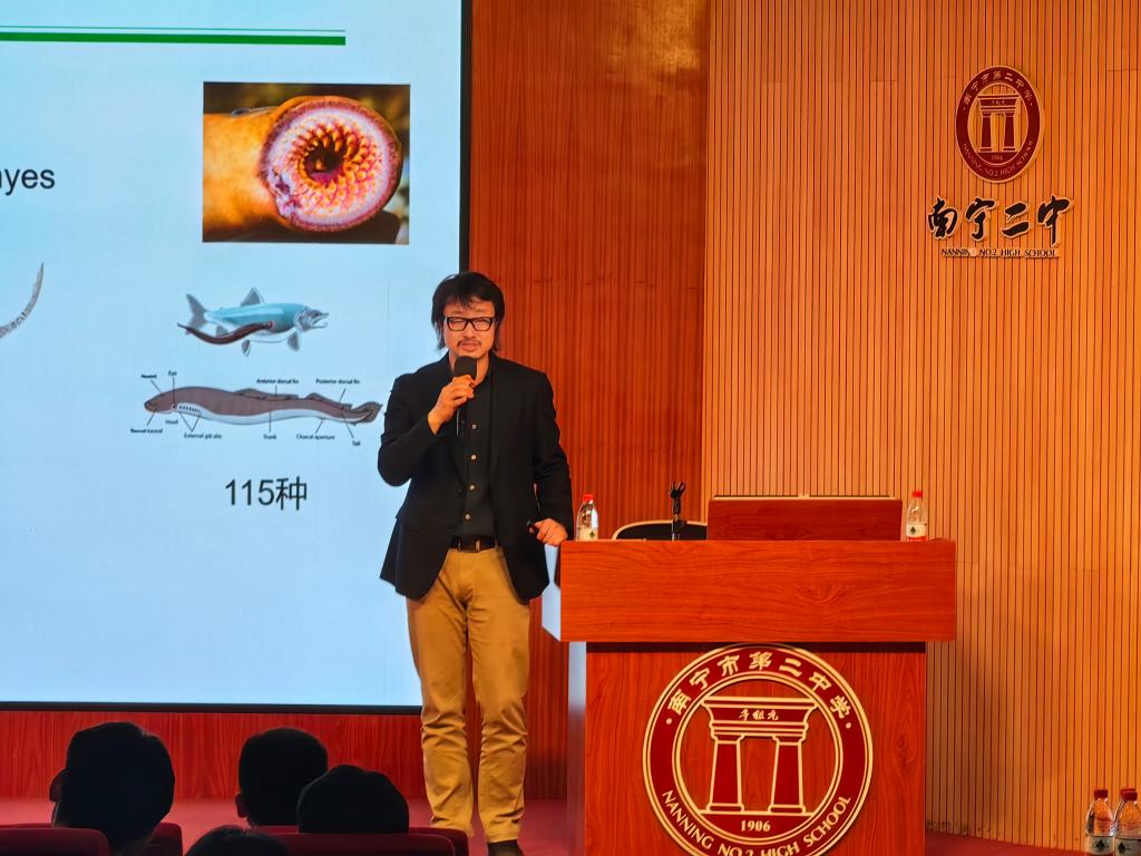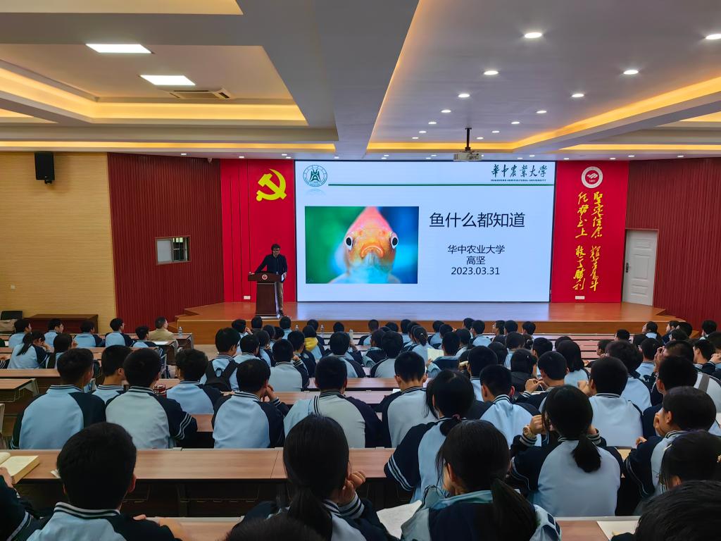 水产学院副院长高坚教授分别给两所中学500余名师生带来了主题为“鱼什么都知道”的科普报告。高坚从鱼的类目、视觉、听觉、繁衍等方面带领同学们走进鱼的世界,他从硬骨鱼、软骨鱼的种类切入,介绍了各种鱼的分类及特点。“同学们,你们觉得鱼能听到声音吗?”高坚向同学们问道,并详细介绍了鱼类听觉器官——韦伯式器的功能。随后他分享了鱼的繁衍,当谈到鮟鱇鱼时,高坚说道:“鮟鱇鱼雌雄异体,但是雌性会是雄性的30多倍,雄鱼会寄生在雌鱼身上,这就是鱼类吃软饭的典型!”幽默的语言瞬间点燃了课堂氛围。报告的最后,高坚对在场高中生发出“邀请函”:“欢迎到麻豆 ,让我们一同去发现水世界的奥秘。”