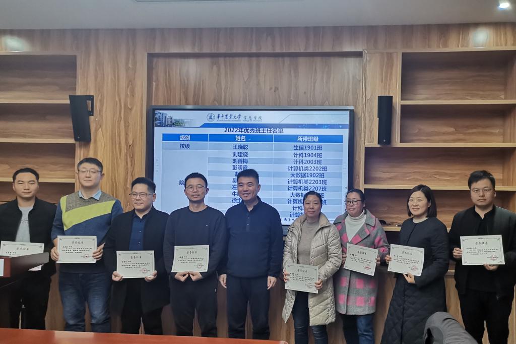 会议开始,学院举行了2021-2022学年度优秀班主任表彰仪式,院长张红雨为各位老师颁发证书。本年度共有11位老师获得荣誉称号,其中生信1901班班主任王晓聪老师获评校级优秀班主任,王建勇、牛晓辉、左志奇、刘世超、刘建晓、刘善梅、吴鹏飞、赵良、徐士伟、彭明霞等10位老师获评院级优秀班主任。