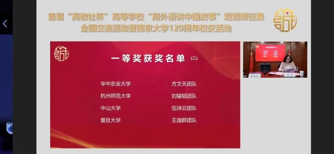 5月14日,2020级计科专业学生李鼎同学团队提交的短视频作品《传承·连结:遇见中国》在首届“高教社杯”高等学校(本科)“用外语讲中国故事”优秀短视频作品征集活动获全国总决赛一等奖(全国共评选8项)、最佳创意奖(全国共评选1项):