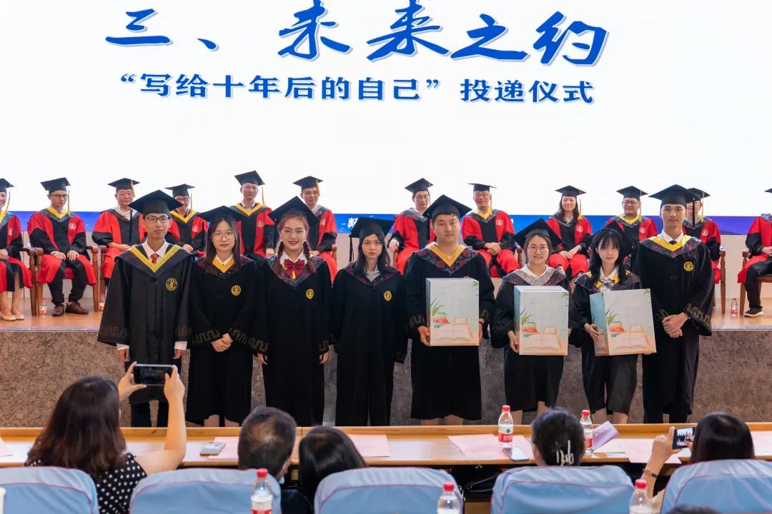 “未来有无数种可能,期待十年后的你能够成为你想成为的人。”毕业前夕,学院发出“十年之约”,倡议每一位毕业生为十年后的自己写一封信。盛典之上,在老师和家长们的共同见证下,班级代表将全班同学一封封承载着愿景与许诺的信件投入定制信箱,由学院妥善保存。十年相逢之时,就是信件重启之时。计科1802班郭瀚泽代表全体毕业生笃定立志:“愿10年、20年,30年后的我们能够告诉母校,我们如何做到。”