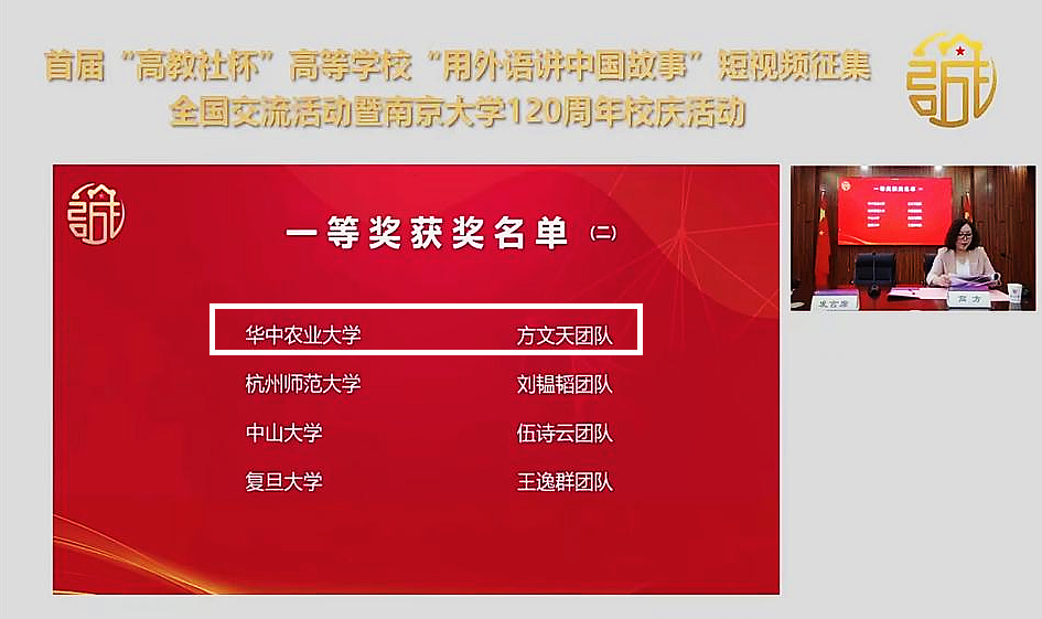 2022年5月14日,由全国高等学校大学外语教学研究会指导、南京大学主办、高等教育出版社协办的全国总决选在线举行。麻豆 麻豆 的李鼎、方文天、董根、王振南、陈铭等同学提交的短视频作品《传承·连结:遇见中国》获得全国一等奖(排名全国第五)、最佳创意奖(全国唯一),同时麻豆 还获得了优秀组织奖。
