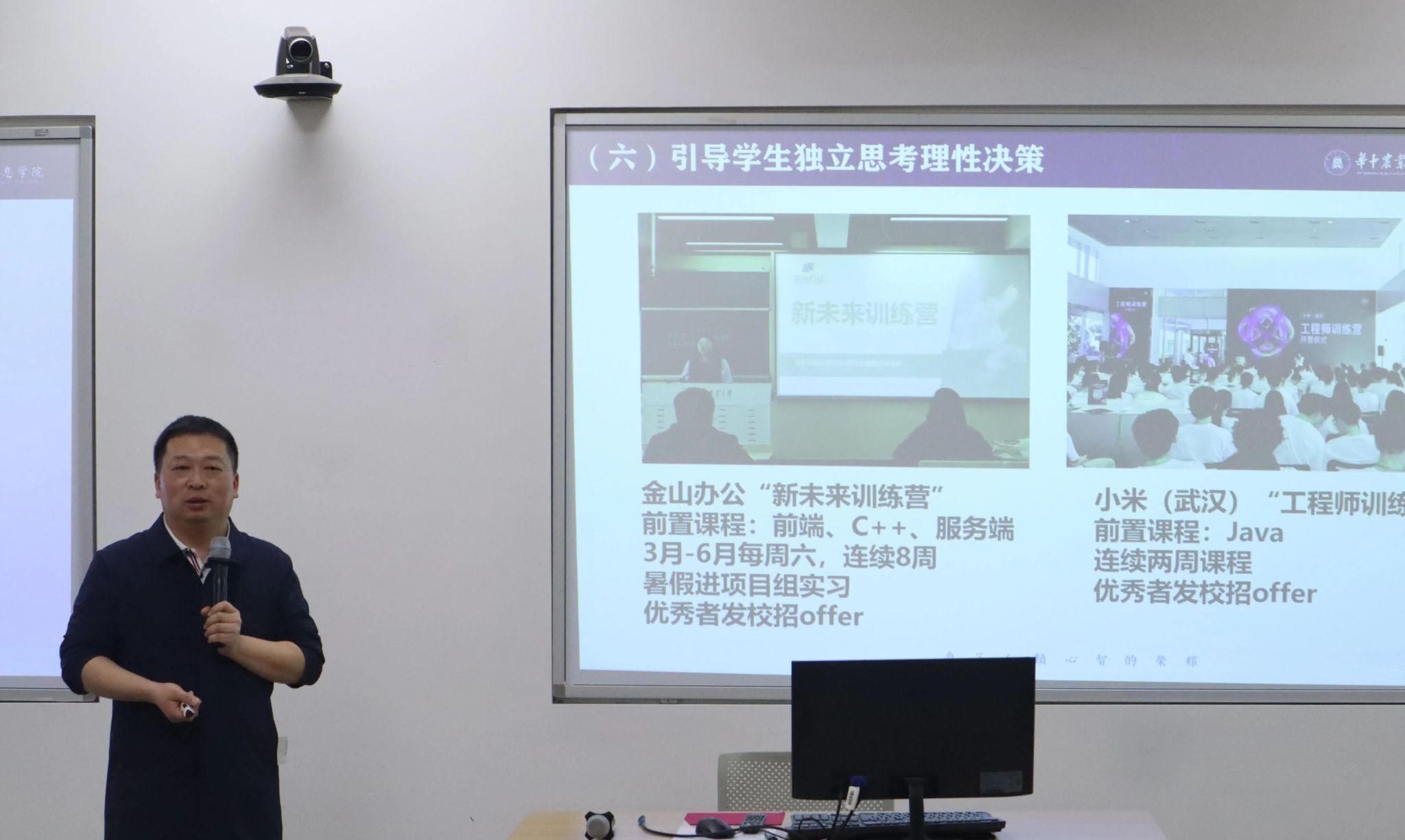结合学院实际,刘进重点强调了六个方面的具体工作。一是希望班主任紧抓学风。通过分析上学期各年级、班级和课程成绩数据,建议班主任组织班委查找原因,制定并实施针对性帮扶计划,实时掌握学生学习动态。二是希望班主任重视体育。通过展示学院各年级和班级学生体测及格率,刘进强调体测成绩不仅影响学生毕业、班级评优和学院绩效考核,而且关乎学生的身心健康和一辈子幸福。鼓励班主任带领班级学生走出宿舍,走下网络,走向操场,一起运动,在体育运动中享受乐趣、增强体质、健全人格、锤炼意志。三是希望班主任关注关心各类困难学生。刘进介绍了国家和学校经济资助政策及各级各类奖助学金,提醒班主任需要深入了解、交心谈心的六类群体学生。四是希望班主任经常开展安全与法纪宣传教育。具体包括电信诈骗、消防安全、交通安全、政治安全、网络文明、遵纪守法、公序良俗等方面,提升学生的安全意识和法纪观念。五是希望班主任引导学生五育融通,全面发展。破除“功利主义”“绩点导向”,鼓励学生多读书,多参加实习实践和志愿服务活动,涉猎人文知识、接受艺术熏陶、参加艺术实践,积极投身科研实践和创新创业竞赛,积极参加社会工作和国际交流。六是希望班主任引导学生独立思考、理性决策。刘进分享了近五年各专业升学考研和就业数据,介绍了学院正在进行的金山、小米企业课程项目。建议班主任引导学生客观分析就业形势政策和市场行业趋势,针对不同学生特点,帮助学生做好大学生涯发展和职业规划,在人生选择中理性决策。