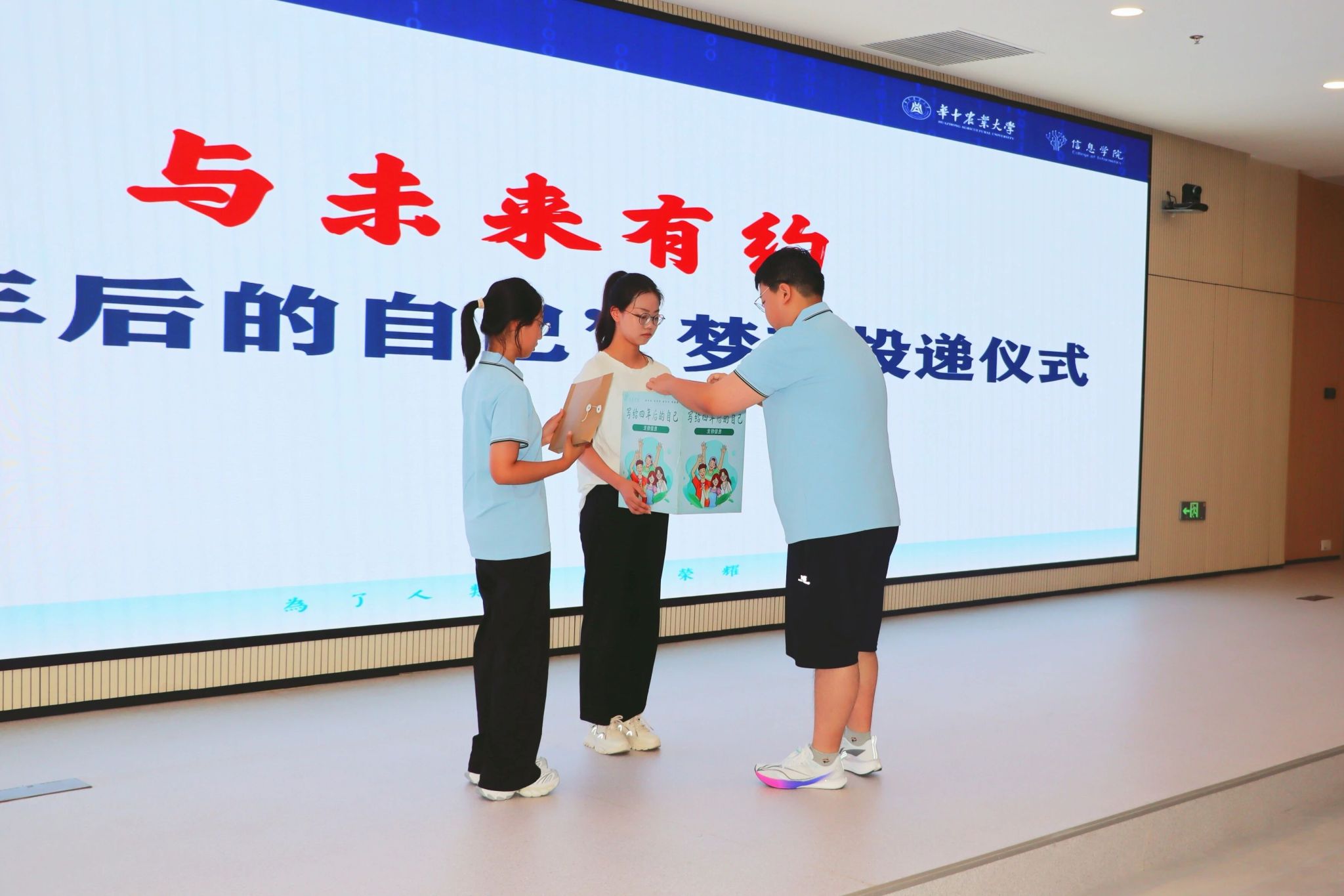 麻豆 连续多年开展“致四年后的自己”梦想投递仪式,这已成为新生入学教育中一项颇具意义的传统。在此次集结式中,各班代表依次上台,将封装好的信件投入专业定制信箱。这些信件将由学院统一保管,并于四年后的毕业典礼上重启,让每一位毕业生重温初心,检视成长。