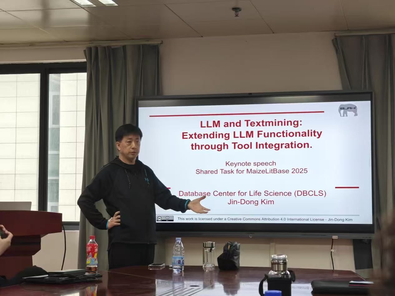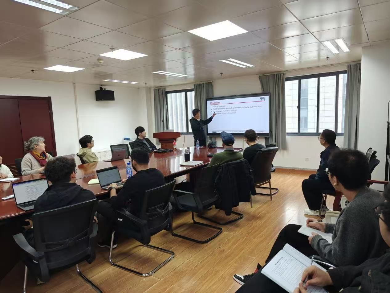 报告人Jin-Dong Kim博士来自日本信息与系统研究机构(ROIS)研究院,为生物医学自然语言处理(BioNLP)领域知名学者。报告中,Jin-Dong博士从“工具集成”角度出发,探讨了如何通过“Function Calling”机制让大语言模型实现功能扩展。他指出,当前研究正从传统“纯文本生成”转向“模型与工具协同”新阶段,使LLM(Large Language Model,大型语言模型)能主动调用外部知识库、API服务或可视化平台,实现知识检索、语义比对与智能操作的深度融合。以其团队研发的PubDictionaries平台为例,Jin-Dong博士详细介绍了该系统的架构与功能。PubDictionaries是一个开放式字典资源库,收录了大量生物学与医学术语的映射关系,系统结合PubMedBERT模型计算术语间的语义相似度,并通过余弦相似度完成概念匹配,用户可通过批量上传、人工录入与手动录入等三类录入方式灵活管理词条,实现自动化批量导入与人工精修的结合,从而显著提高语料的可用性与互操作性。