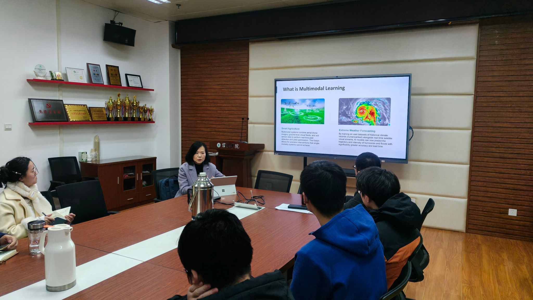 互动环节,师生围绕多模态模型图片分类问题、农业数据整合可行性、时序数据处理潜力等议题展开热烈讨论。张薇副教授针对农业领域中图像、文本与传感器时序数据的融合应用,提出这是未经探索的前沿方向,鼓励师生深入挖掘。