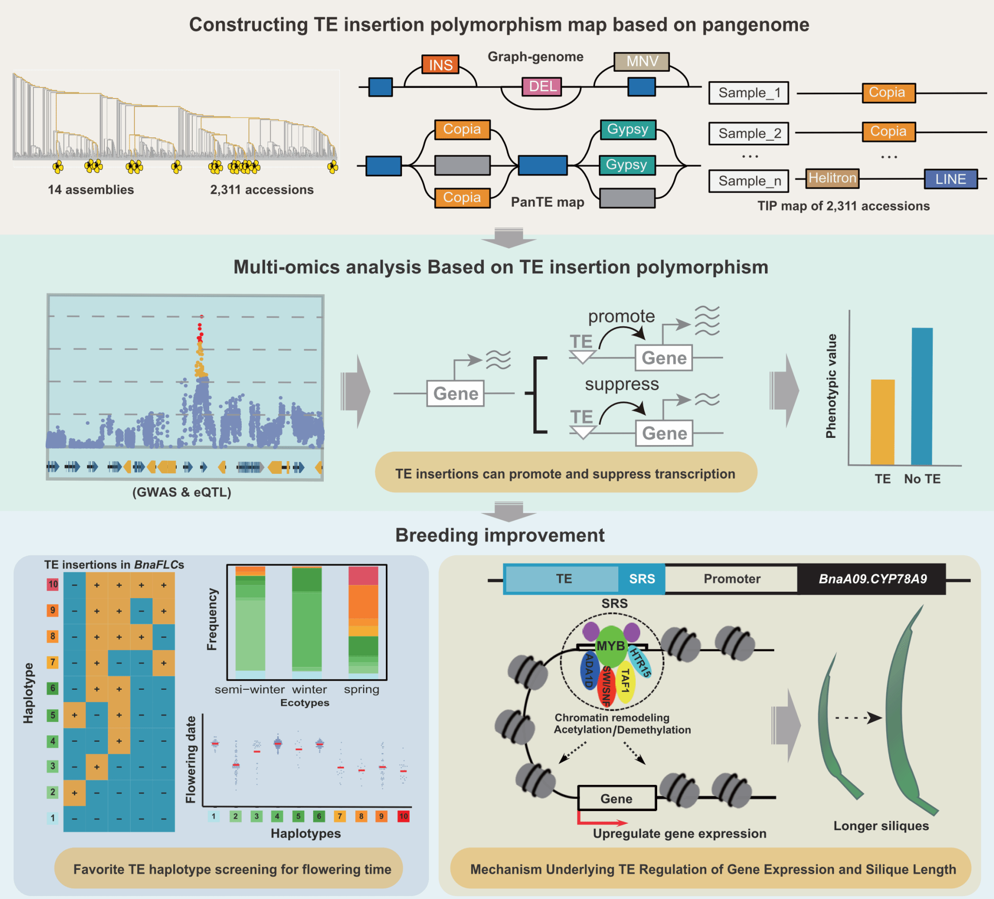 油菜是世界重要的油料作物,在我国粮油安全战略中具有不可替代的地位。作为一个约 7,500 年前由白菜与甘蓝自然杂交形成的异源四倍体物种,它在长期驯化和育种过程中形成了冬性、半冬性与春性等不同生态类型,并在产量、品质和抗性方面经历了持续改良。在油菜这样复杂的基因组结构中,转座子占据了 56%–62% 的序列,被视为植物基因组中最活跃、最具多样性的遗传因素之一。曾长期被认为是“基因组暗物质”甚至“垃圾 DNA”的转座子,近年来被越来越多研究证明其在基因调控、染色质重塑、生物进化及农艺性状形成中发挥关键作用。然而,油菜中规模化、系统性转座子多态性图谱一直缺乏,限制了人们从更深层次理解油菜遗传变异来源及其重要功能。