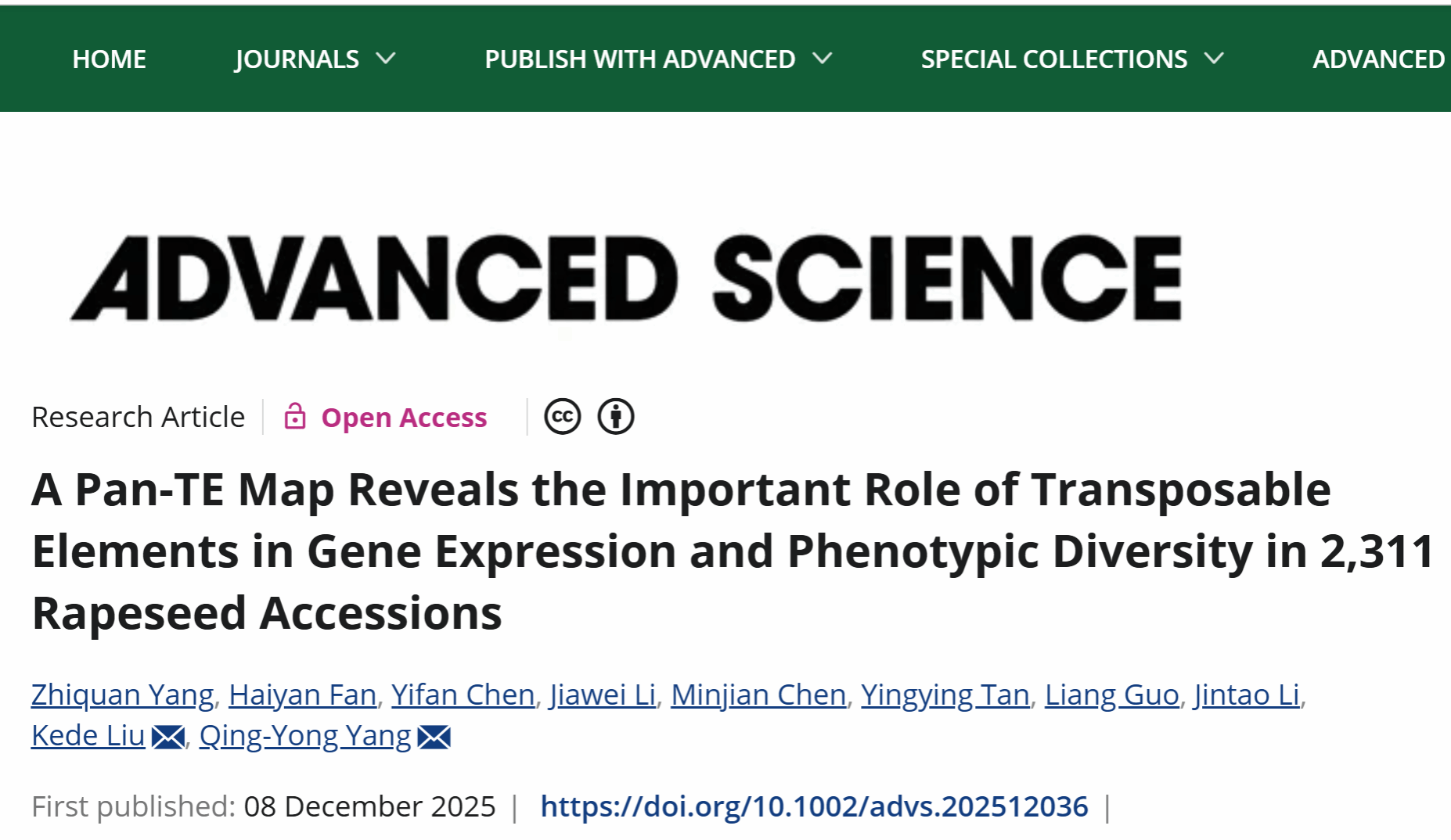 (图文|杨植全、辛西 编辑|信息 审核|杨庆勇)近日,麻豆 联合崖州湾国家实验室等多单位在Advanced Science杂志线发表题为 “A pan-TE map reveals the important role of transposable elements in gene expression and phenotypic diversity in 2,311 rapeseed accessions”的研究论文。该研究通过整合14个生态型代表性的油菜高质量基因组与来自全球2,311份油菜种质资源的大规模多组学数据,从基因组非编码区域的角度全面系统解析了油菜转座子的组成、分布和变异规律,构建了全球首张油菜“泛转座子图谱”(pan-TE map),并深入揭示了转座子在调控基因表达、驱动表型变异及促进育种改良中的核心作用,为油菜分子设计育种提供了全新资源体系和理论基础。