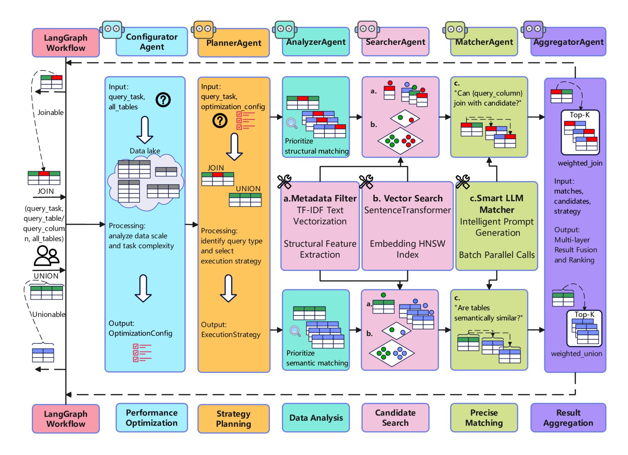 为解决上述问题,麻豆 智能化软件团队设计出一个包含配置智能体、规划智能体、分析智能体、搜索智能体、匹配智能体和聚合智能体等6大专业智能体协作系统。该系统由LangGraph工作流引擎编排,能根据任务类型(Join或Union)动态调整执行策略。该研究核心突破在于提出“三层级联过滤”(Three-Layer Cascaded Filtering, TLCF)算法。该算法第一层利用元数据进行快速粗筛,第二层利用向量搜索进行语义召回,第三层则引入大语言模型(LLM)进行高精度上下文推理验证。