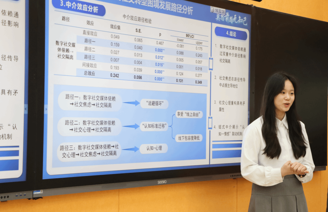 答辩现场亮点纷呈,各个小队充分展示了数月来的实践成果。从前期流程设计到最终落地实施,小队通过分工协作将复杂问题拆解为模块,逐步优化突破。聚焦选题,通过问卷调查和实地访谈梳理出核心问题,逐步搭建起分析框架;结合专业特色,灵活运用随机森林预测、logistic模型、结构方程模型验证等方法层层推进研究;成果呈现方式多样,文本情感分析、词云可视化技术、小提琴图、碎石图等多种形式让复杂结论变得一目了然。