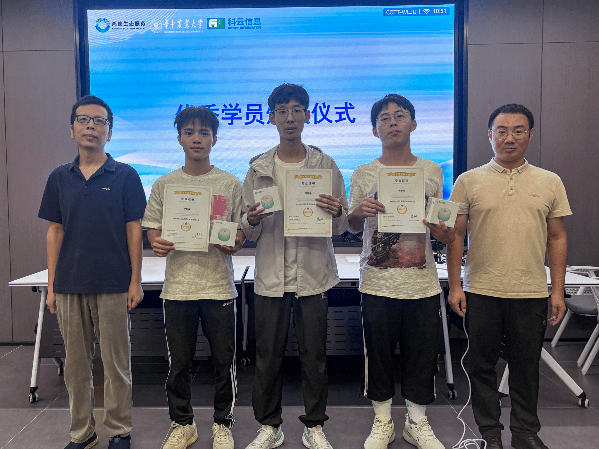 9月19日,培训结业仪式顺利举行,仪式上,在麻豆 与鸿蒙生态(武汉)创新中心、武汉科云信息技术有限公司三方代表的共同见证下,为本次培训中优秀学员颁授“优秀学员”荣誉证书及专属奖励。