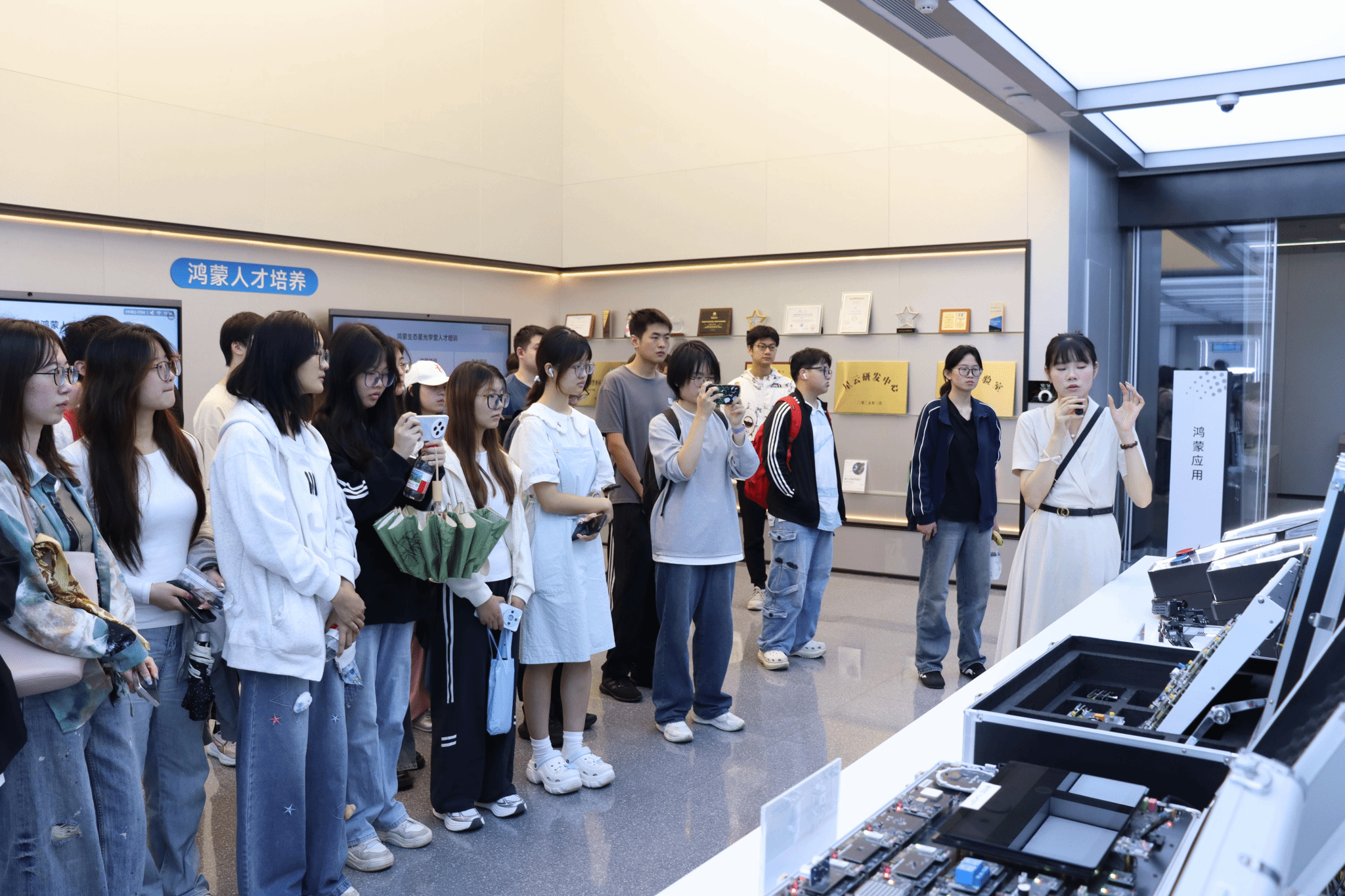 培训次日,麻豆 参训学生们走进鸿蒙生态(武汉)创新中心,开展实地调研。近距离感受鸿蒙系统构建的万物互联智能生态场景学生们参观了鸿蒙系统在智能家电、工业设备等场景中的应用案例,深入了解其分布式架构的技术优势。通过现场讲解与互动体验,学生们能够直观感受到鸿蒙生态的创新活力,为他们未来投身智能技术领域指明了方向。