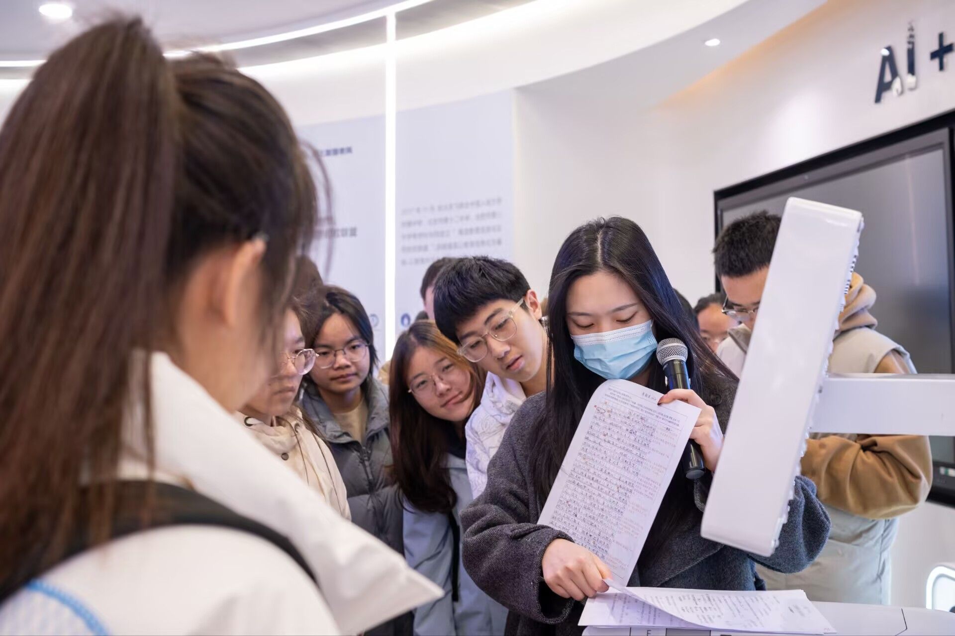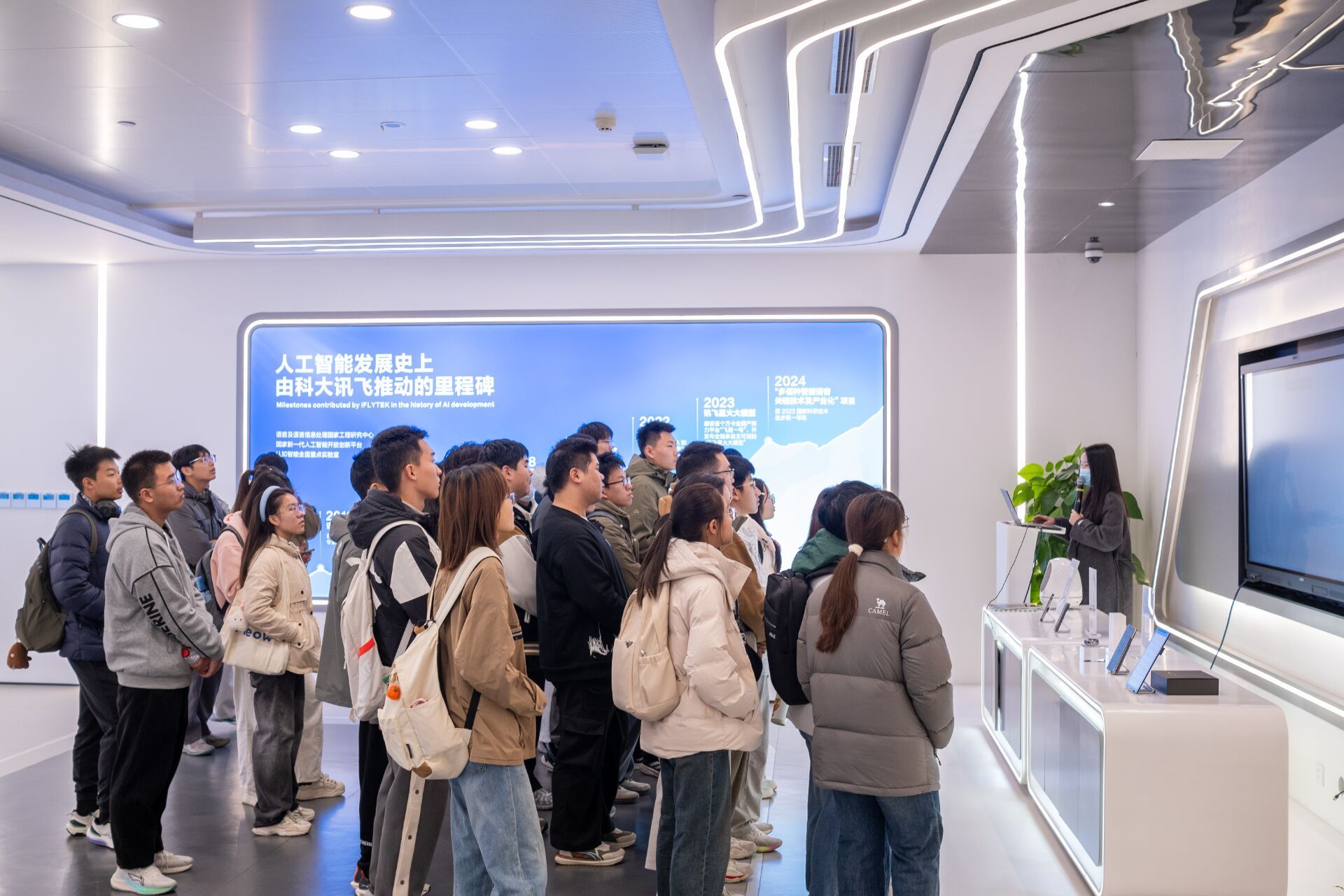 在科大讯飞华中总部展厅参观过程中,工作人员通过系统演示与生动讲解,向同学们全面介绍了其作为中国智能语音与人工智能先行者的发展历程与技术布局。在智能语音、自然语言理解、机器学习等领域持续突破,其“AI+办公”“AI+教育”“AI+医疗”等一系列行业解决方案,给同学们展现了人工智能技术赋能千行百业的广阔前景。在重点展示的“AI+医疗”板块,同学们深入了解了人工智能在辅助诊断、影像分析、健康管理等场景中的实际应用。通过现场交互体验,大家切身感受到语音识别、大数据分析等技术与医疗健康领域深度融合所带来的效率提升与服务革新。
