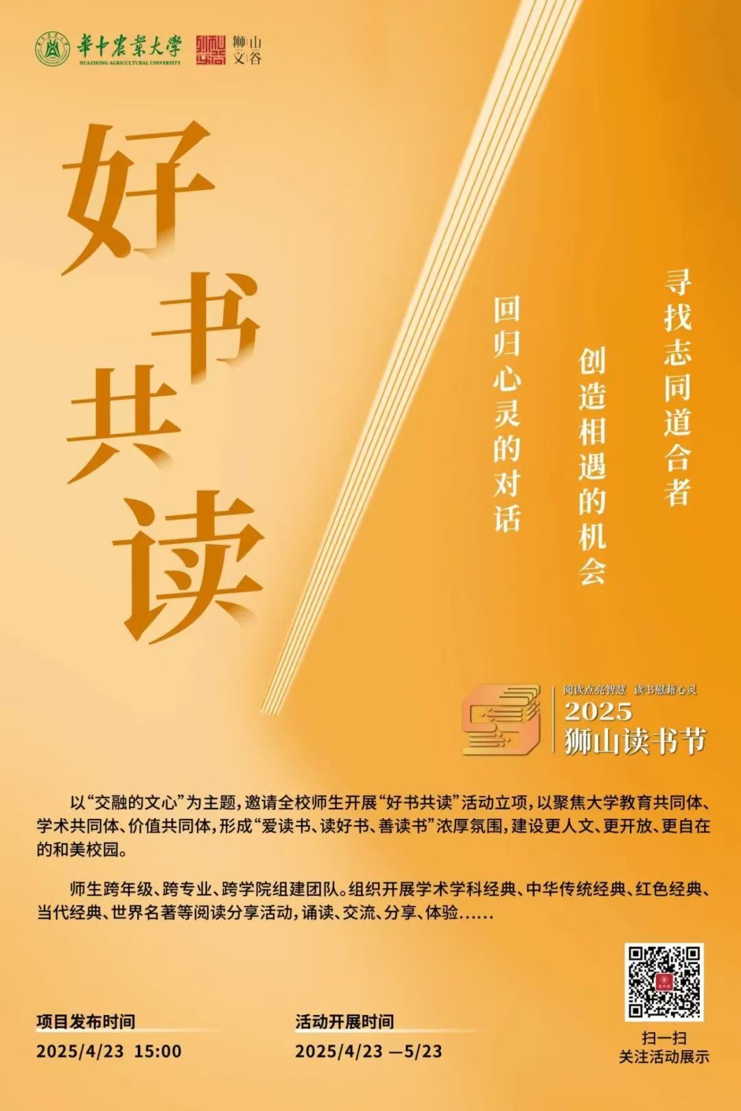 4月22日,2025狮山读书节组委会发布立项公示,拟对28个项目立项资助扶持。其中,麻豆 辅导员叶双休负责的“甜蜜革命:解码血糖密码”、辅导员任彦儒负责的“‘红色经典,共读共情’读书分享活动”、研究生何相君负责的“鉴往知来 勇担使命——张之洞历史实践与新时代发展启示读书分享”等3个项目获得立项。