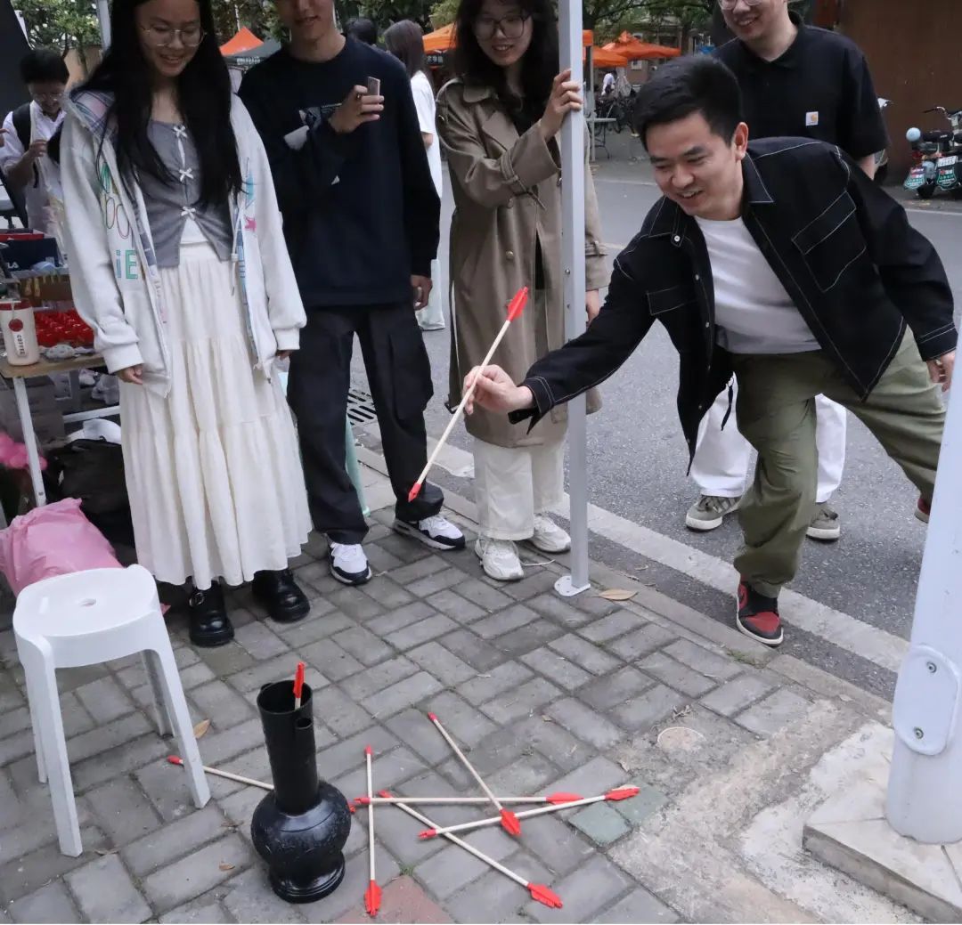 “心箭・星棋” 掷球投壶组合区则化身为技巧与智慧的比拼场域。发令声起,参赛者轮番上阵,精准投掷小球,试图让球落入棋盘小孔,双方在你来我往中不断调整策略。投壶环节同样吸引众多师生驻足围观,十支箭矢投掷时的轨迹,一次次引发众人屏息关注。