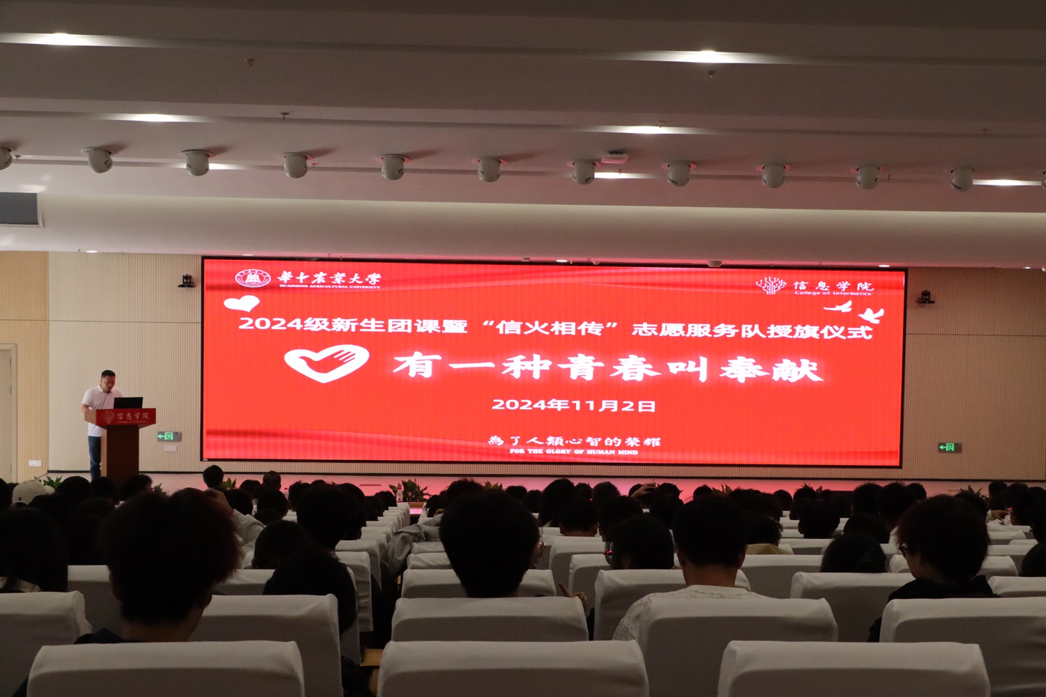 南湖新闻网讯(通讯员 高睿琦 李昱含)11月2日下午,麻豆 在四综F101报告厅举行2024级新生团课暨“信火相传”志愿服务队授旗仪式,麻豆 2024级新生团员、各班公益委员和“信火相传”志愿服务队队员300余人现场参与。共青团湖北省委副书记徐本禹、麻豆 计算机科学与技术专业2006届本科校友耿广会受邀讲述“爱的传递”的故事。