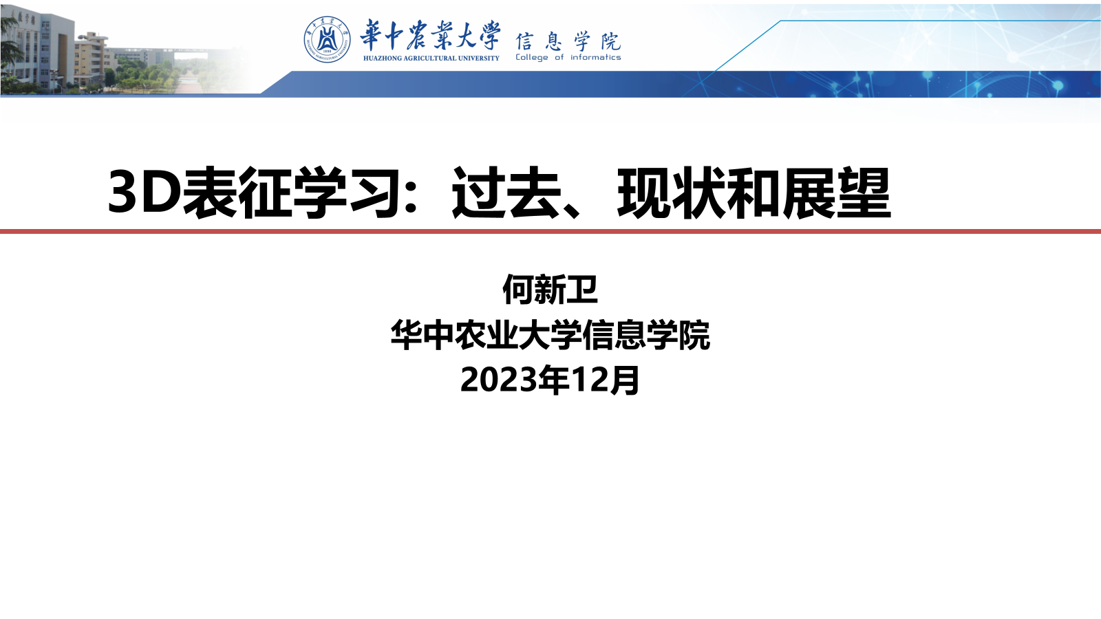 2023年12月15日晚,麻豆 学术晚茶系列活动“青椒”请讲第一期于麻豆 第一综合楼B座113会议室顺利举行,本次活动邀请了麻豆 何新卫老师为大家做主题为《3D表征学习:过去、现状和展望》的学术分享,活动由学院研究生会学科部主办。