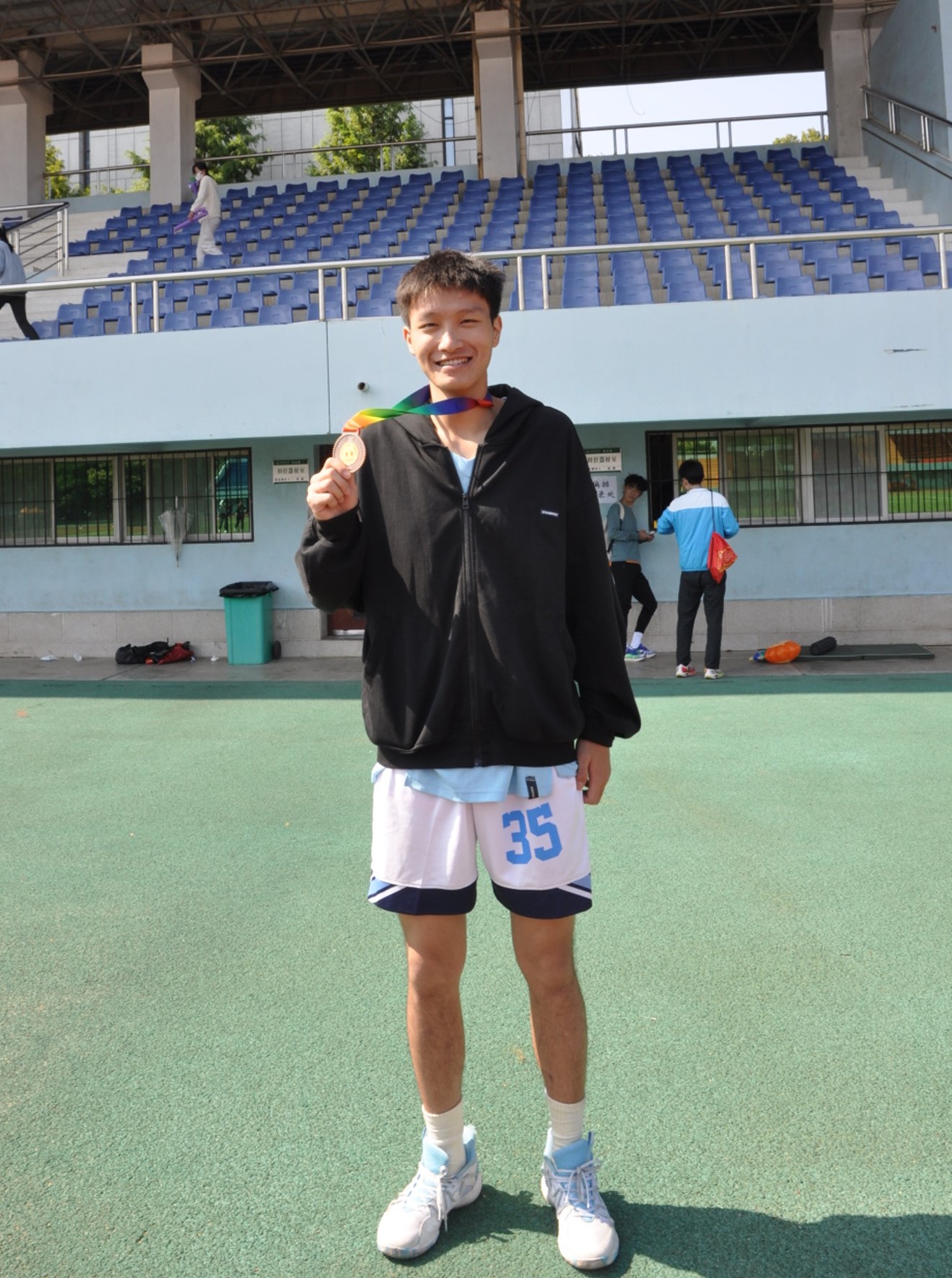 信息与计算科学2101班的黄凯阳同学在布散朝阳的跑道上快步流星并以56秒22的成绩获得学生男子400米决赛第三名。