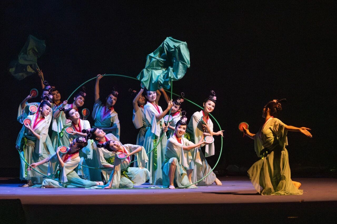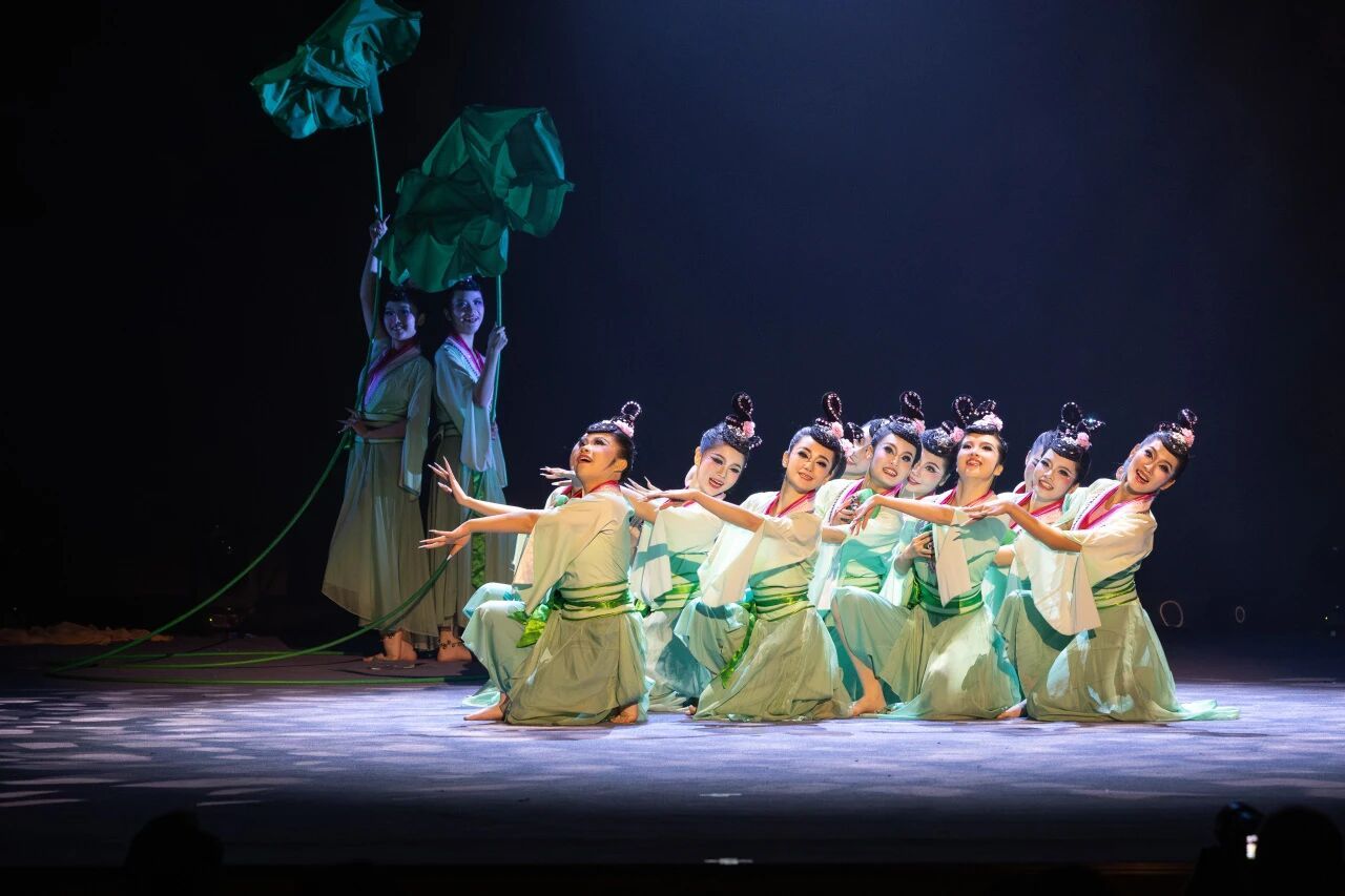 舞蹈《莲鼓越歌行》以莲为魂、以鼓为韵,巧妙融合了传统民间舞蹈的灵动与古典舞的雅致。轻盈旋转的裙摆似水中绽放的莲瓣,传递出“出淤泥而不染”的君子风骨,清脆激昂的莲鼓鼓点与“放河灯”等动作结合,将观众带入“泛水采芙蓉,归来衣更香”的唯美江南画卷中,唤醒着人们对祈福文化的记忆。舞者们时而翩跹如莲,时而随鼓点顿挫起舞,将传统美学中“刚柔并济”的特质展现得淋漓尽致,将一幅流动的传统画卷在舞台上徐徐展开。