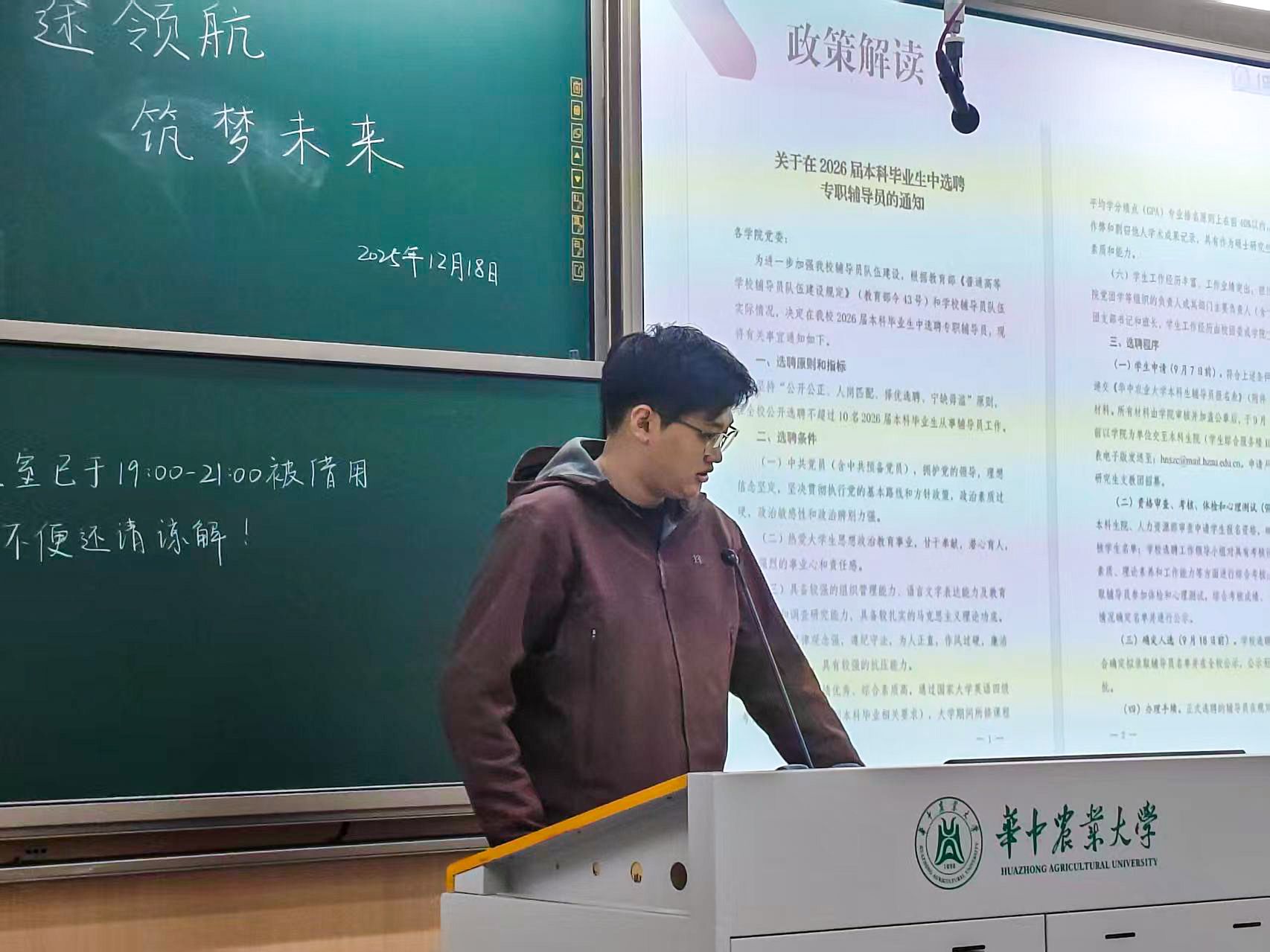 现任本科生院思政处助管、入选专职辅导员项目的人工智能2202班李圣希同学详细解读了该项目对政治面貌、成绩排名、学生工作经历等硬性条件的要求,建议意向同学提前学习相关政策性文件,积累主要学生骨干任职经历,及时留存各类资料证明。同时,他以幽默的口吻提醒同学们理性评估自身与岗位的匹配度,避免盲目选择。