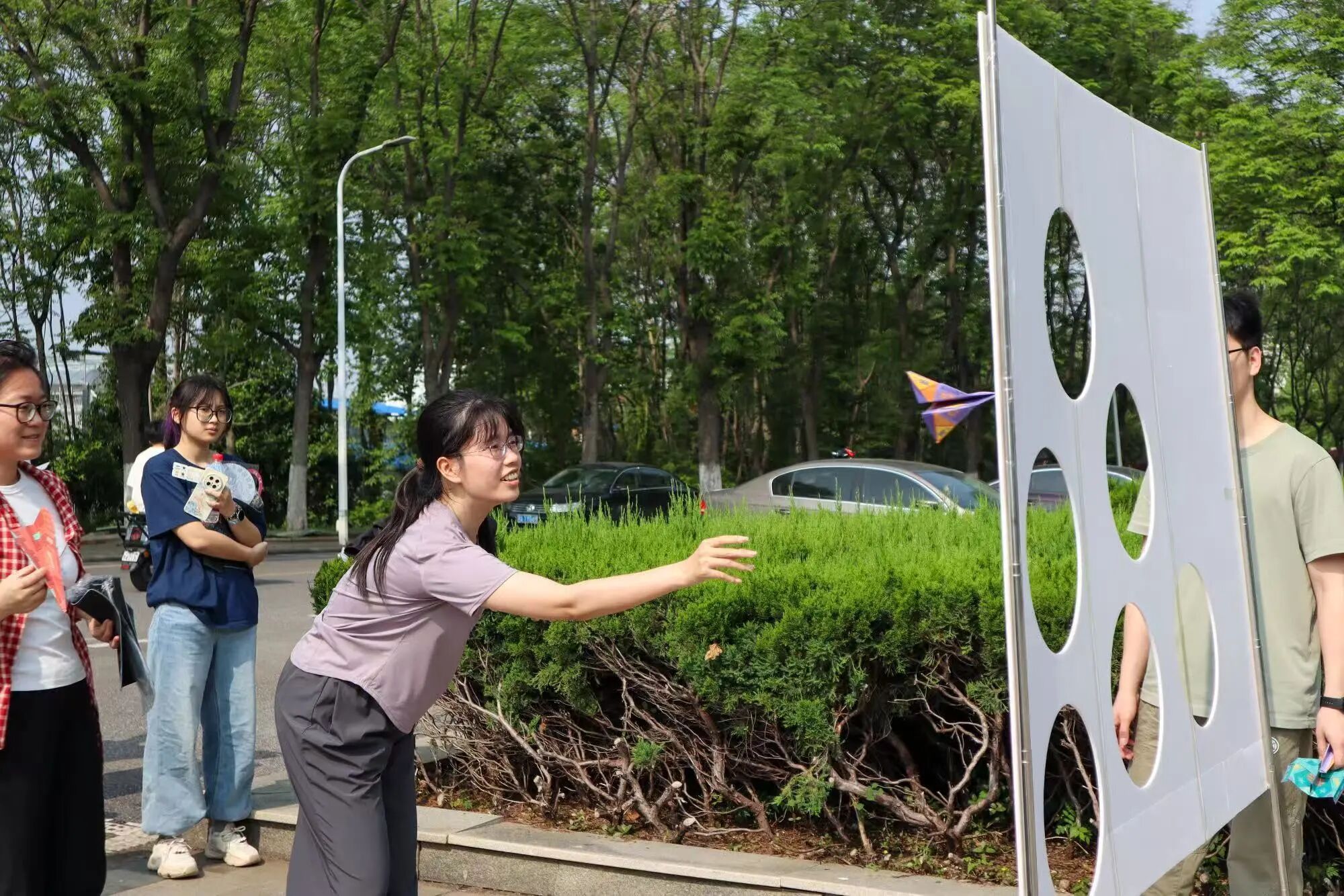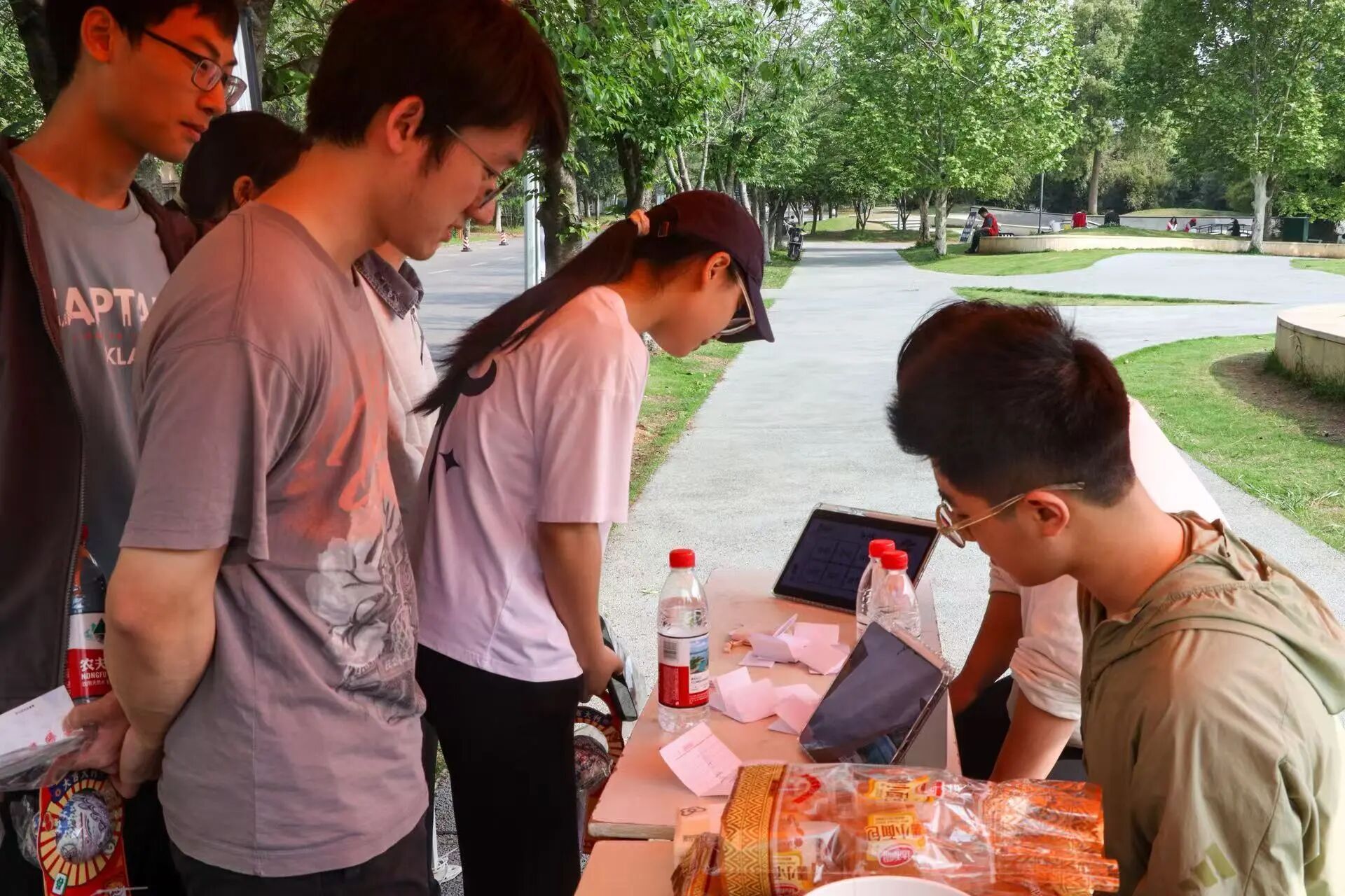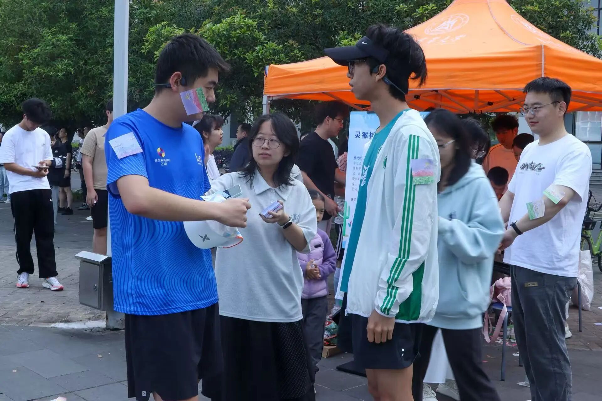 在狮子山广场起点处,同学们化身“灵活小猴”在30秒内抖落全身10张便利贴,为接下来的路程平添了几分轻松惬意。二运篮球场的旺犬破靶·福猪盲盒破彩赛同样人气高涨,“微积分!”“数据结构!”——大家手持飞镖瞄准3米外粘有不同课程名称的气球,随着一声声脆响,气球应声而破。其余打卡点同样趣味十足,节奏识词、投掷闯关、纸飞机穿洞等小游戏,让师生们在奔跑中放松身心,全程笑声不断。