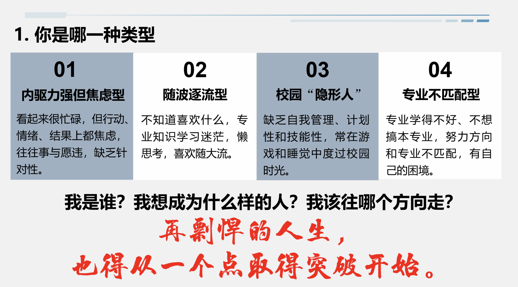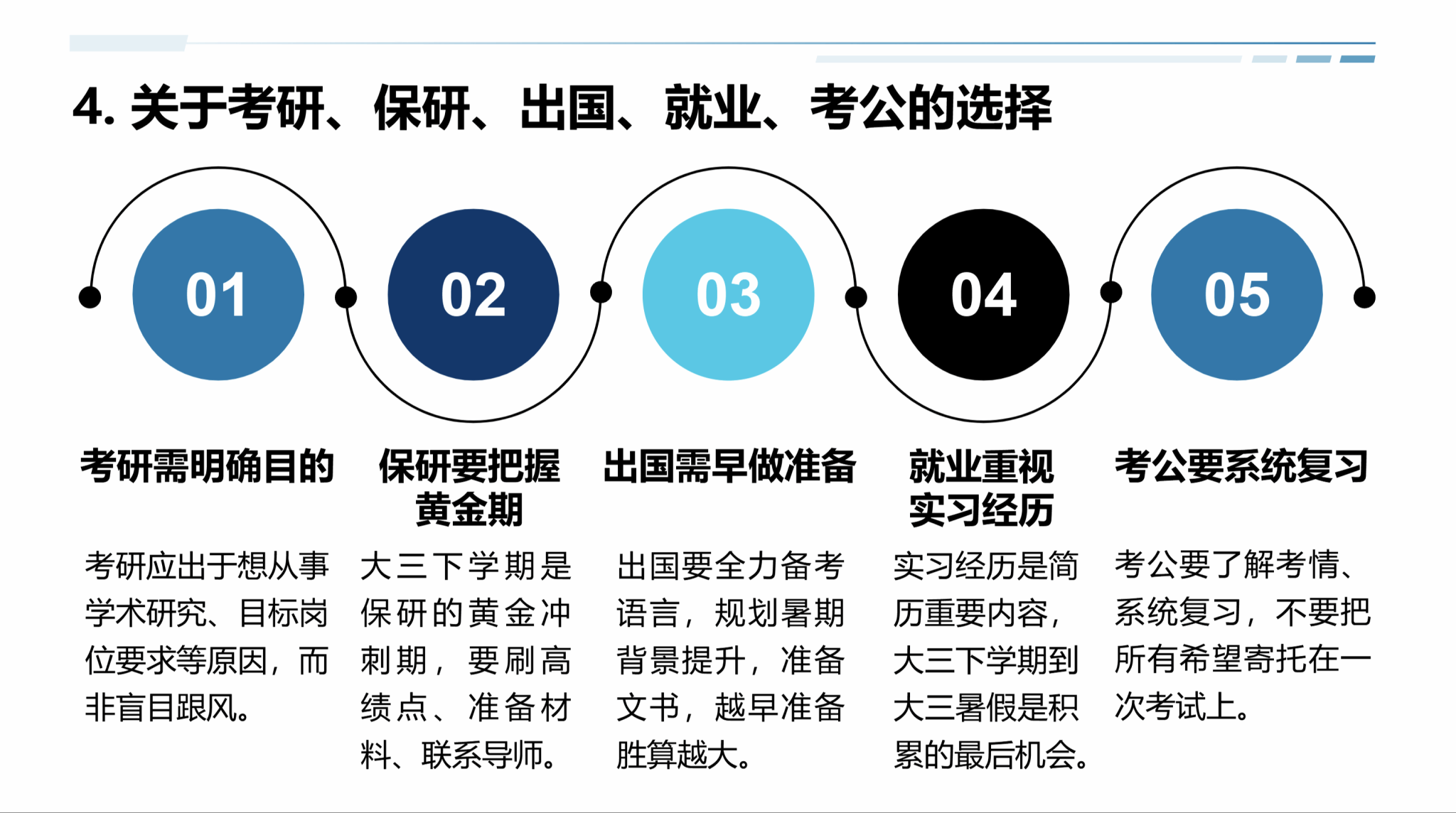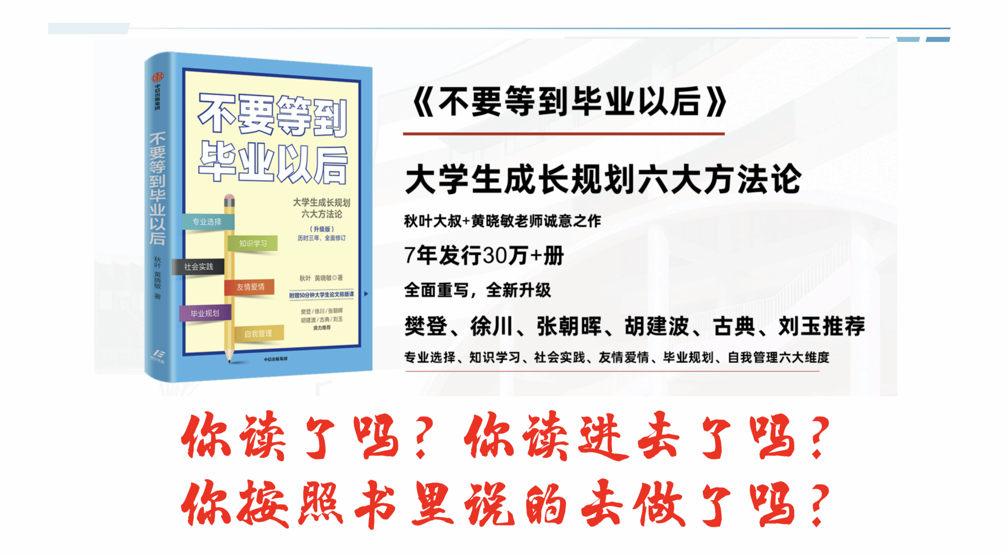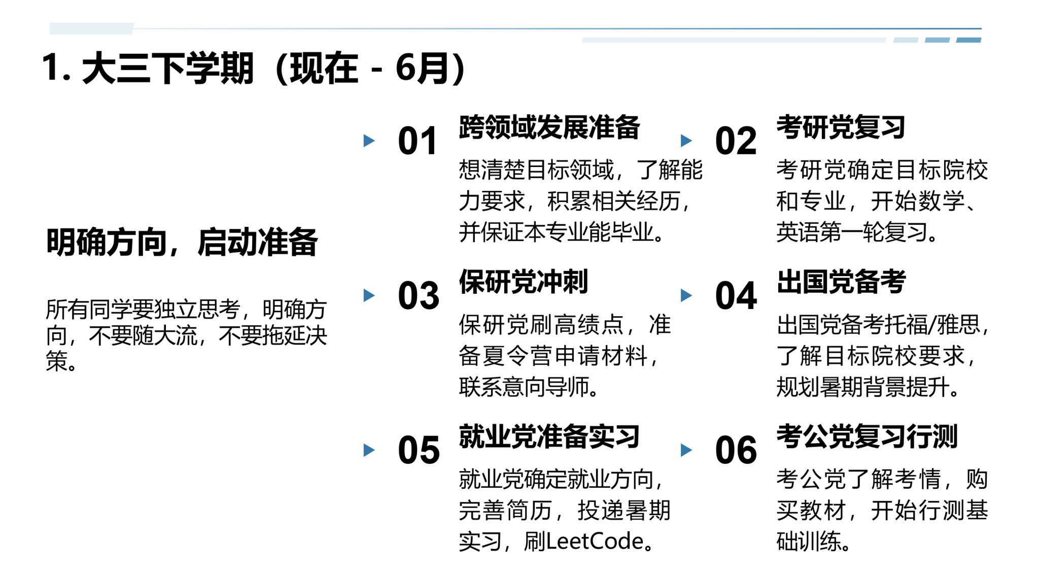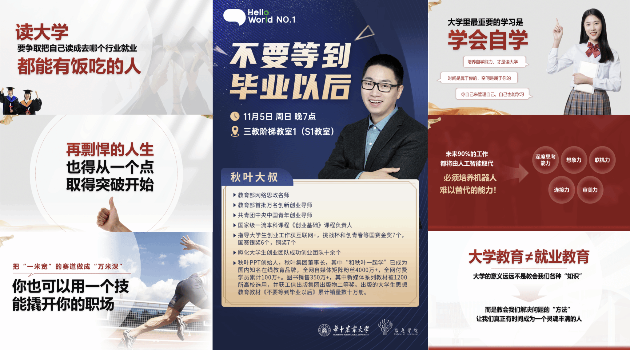 他将当前大学生分为“内驱力强但焦虑型”“随波逐流型”“校园隐形人型”三类,指出“大三的迷茫不可怕,可怕的是用战术上的勤奋掩盖战略上的懒惰”。他强调,自学、自律、自省三个基础能力比任何一门专业课都重要,并围绕考研、保研、出国、就业、考公及跨领域发展等路径给出了具体建议。
