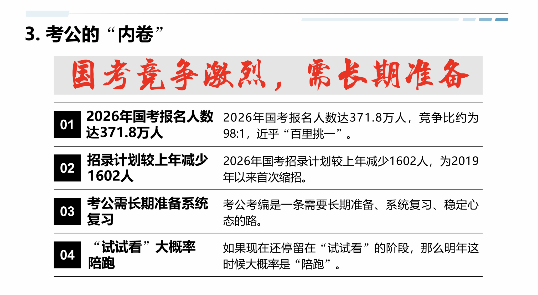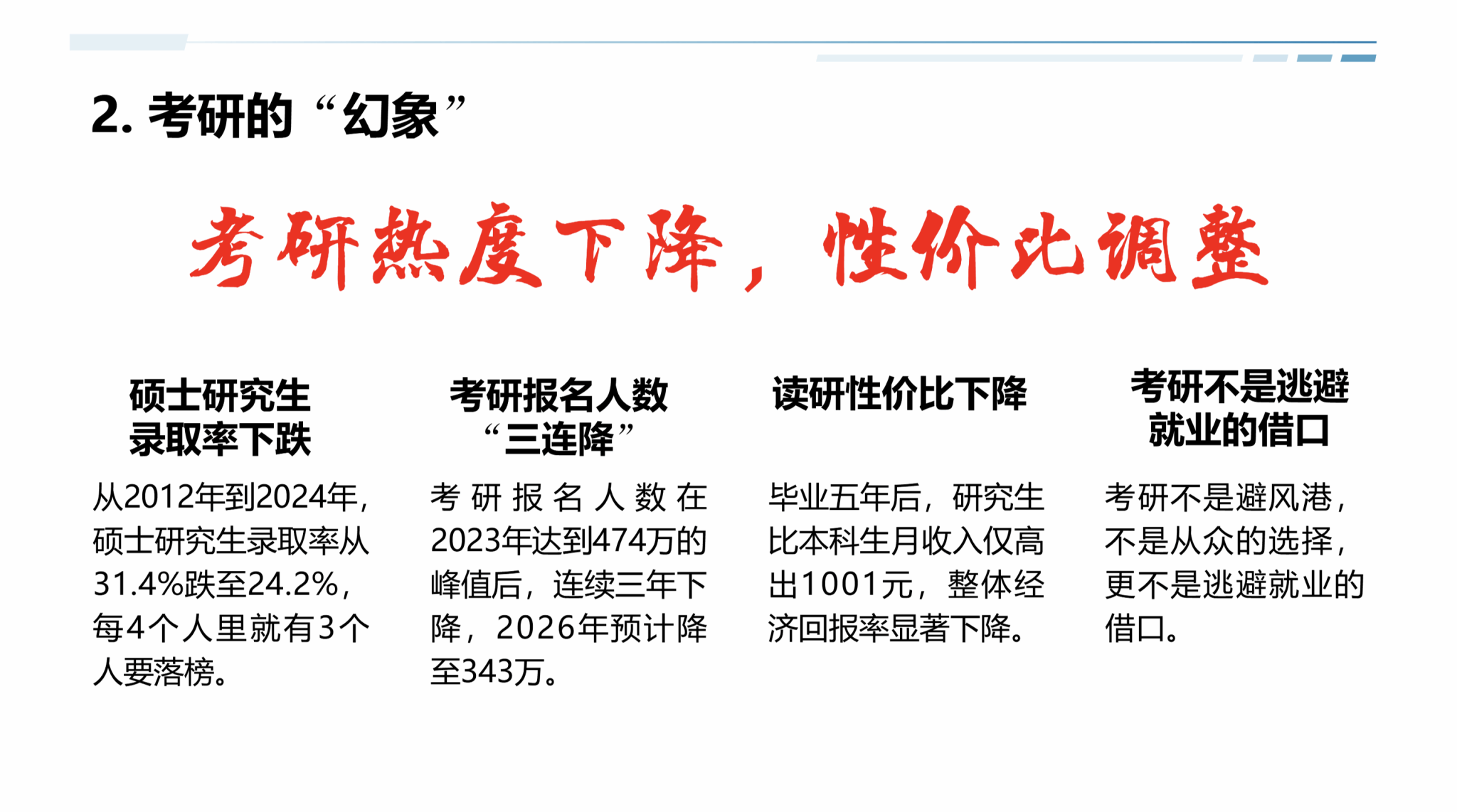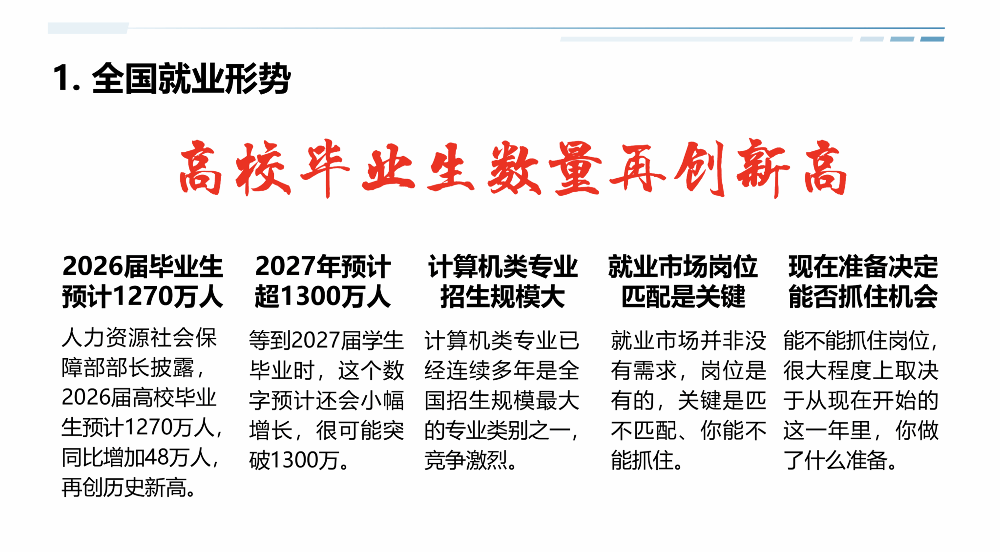 刘进指出,2026届全国高校毕业生预计达1270万人,2027年可能突破1300万。面对激烈竞争,他提醒同学们“岗位是有的,关键是匹配和抓住”。他通过历年数据分析考研“三连降”与考公“百里挑一”的现实,劝诫大家:“考研不是避风港,不是从众的选择,更不是逃避就业的借口。”