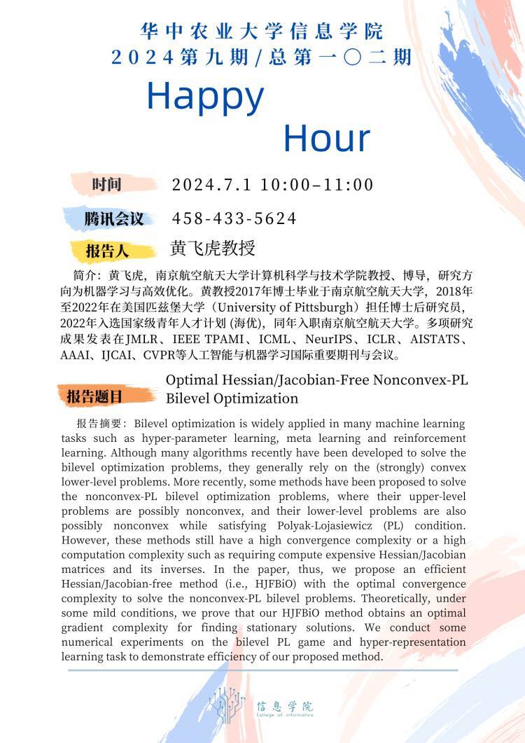 黄飞虎,南京航空航天大学计算机科学与技术学院教授、博导,研究方向为机器学习与高效优化。黄教授2017年博士毕业于南京航空航天大学,2018年至2022年在美国匹兹堡大学(University of Pittsburgh)担任博士后研究员,2022年入选国家级青年人才计划(海优),同年入职南京航空航天大学。多项研究成果发表在JMLR、IEEE TPAMI、ICML、 NeurIPS、 ICLR、AISTATS、AAAI、IJCAI、 CVPR等人工智能与机器学习国际重要期刊与会议。