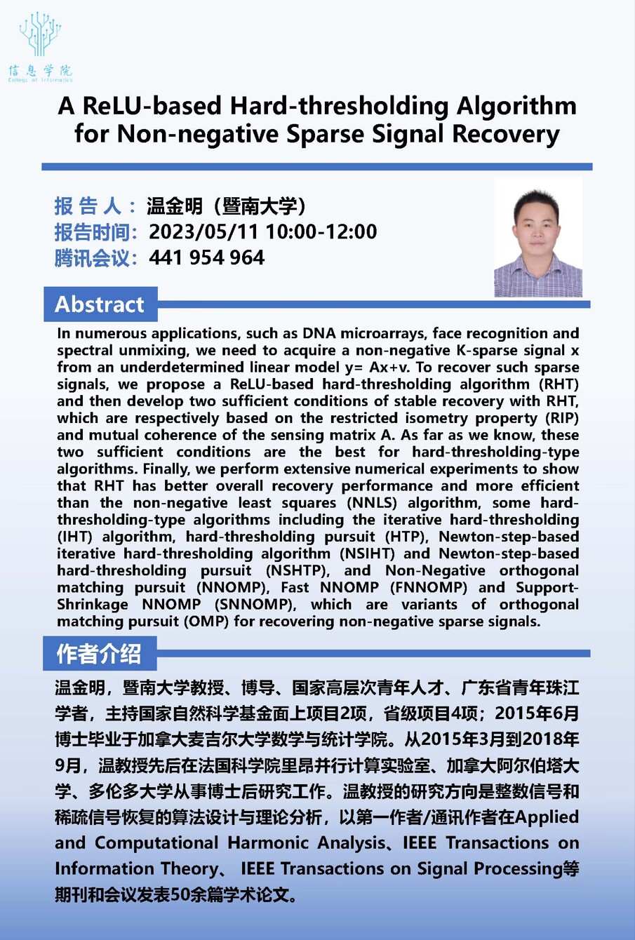 温金明,暨南大学教授、博导、国家高层次青年人才、广东省青年珠江学者,主持国家自然科学基金面上项目2项,省级项目4项;2015年6月博士毕业于加拿大麦吉尔大学数学与统计学院。从2015年3月到2018年9月,温教授先后在法国科学院里昂并行计算实验室、加拿大阿尔伯塔大学、多伦多大学从事博士后研究工作。温教授研究方向是整数信号和稀疏信号恢复的算法设计与理论分析,以第一作者/通讯作者在Applied and Computational Harmonic Analysis、IEEE Transactions on Information Theory、IEEE Transactions on Signal Processing等期刊和会议发表50余篇学术论文。