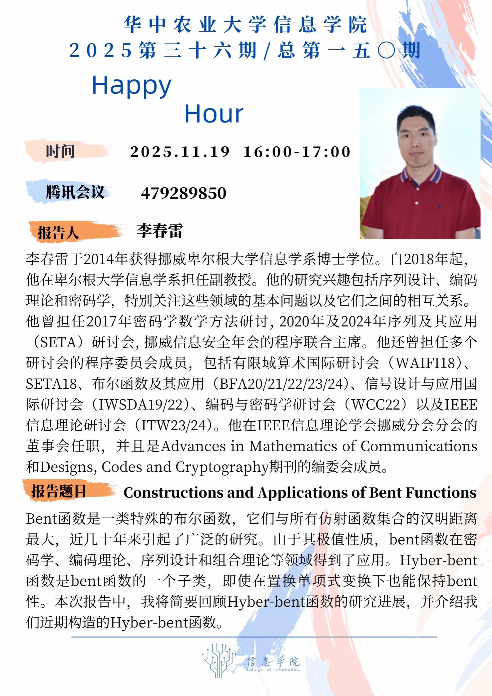 Happy Hour第150期:Constructions and Applications of Bent Functions