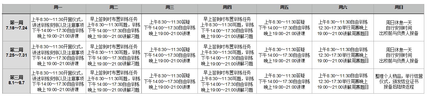 2. 班制设置:本次精英训练营分为基础班与提高班,基础班主要面向没有竞赛基础的同学,提高班主要面向已在ACM集训队的同学。