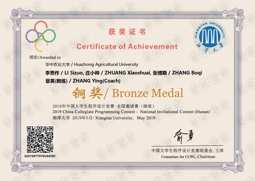 2019年ACM国际大学生程序设计竞赛全国邀请赛西安站——铜奖