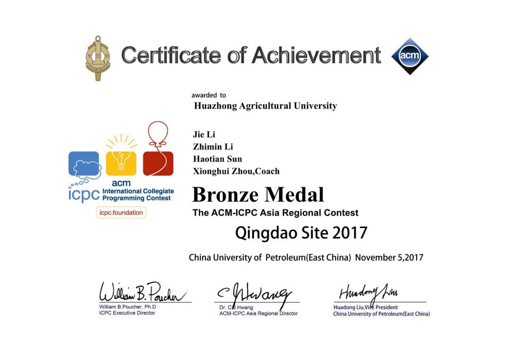 2017年ACM国际大学生程序设计竞赛亚洲区域赛青岛站——铜奖