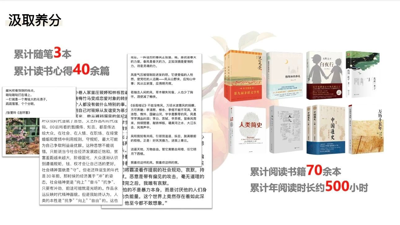 在志愿服务方面,她通过阅读,了解了更多关于人文、历史和社会的深刻思考,这些思考让她在服务同学的同时,更好地为社会贡献自己的力量。