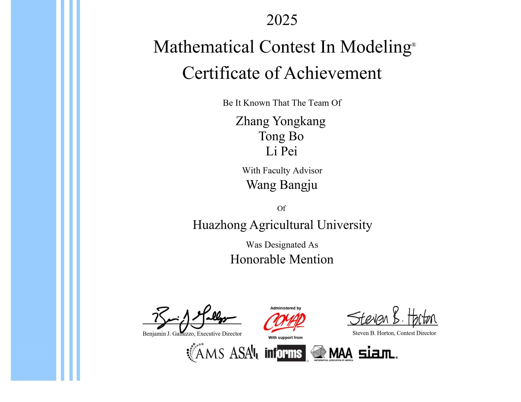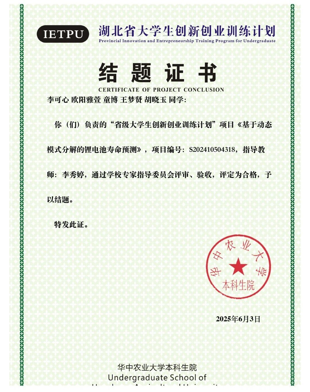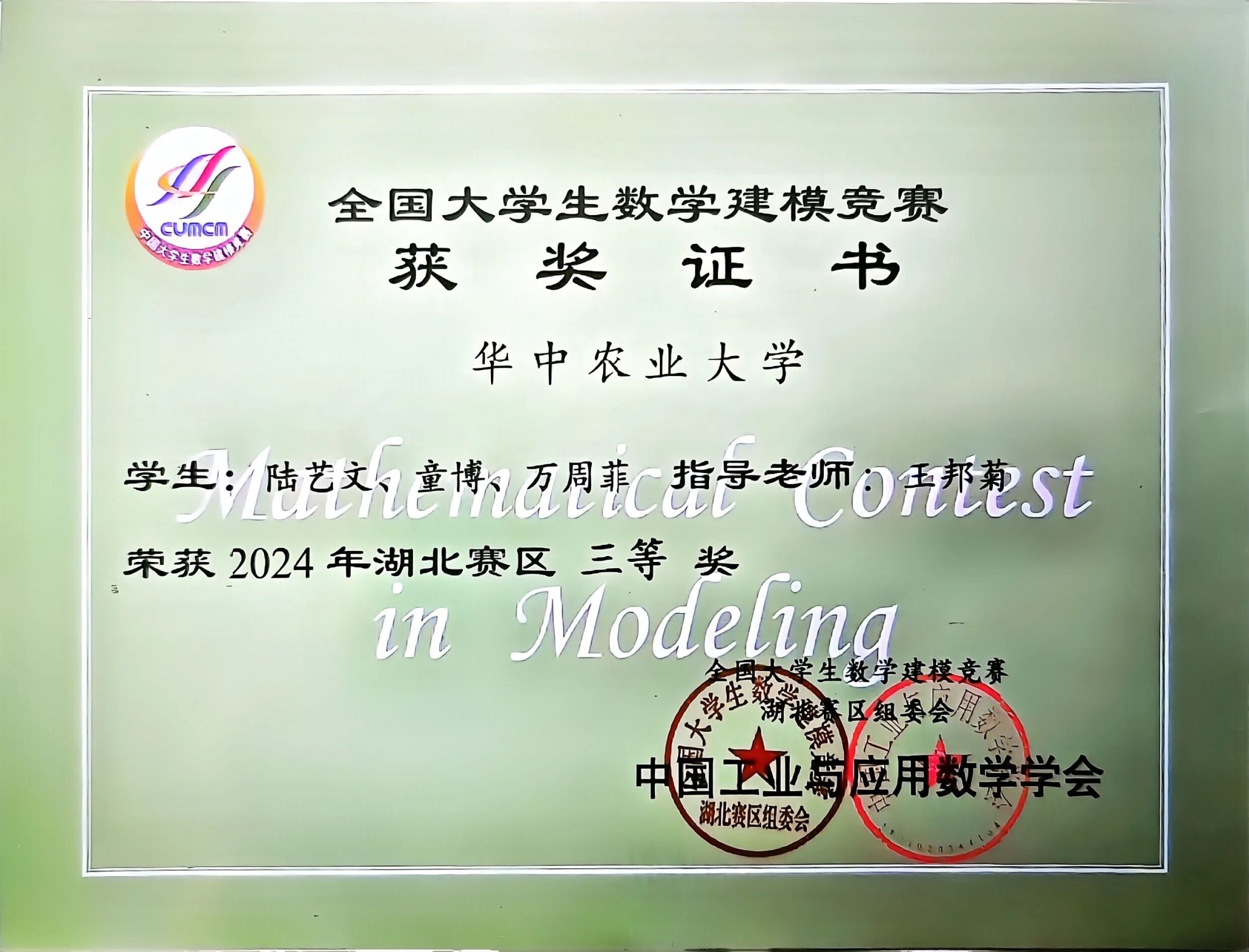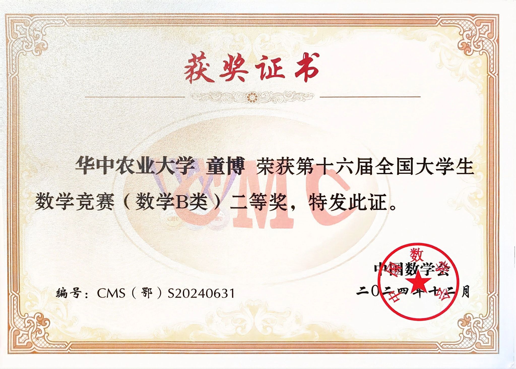 在打牢学科基础的同时,童博积极参与各种学科竞赛,充分筹备,优秀发挥,取得一系列成绩:全国大学生数学竞赛国家级二等奖,美国大学生数学建模竞赛国家级二等奖,华数杯、华中杯大学生数学建模竞赛的省级三等奖、一等奖。为了将所学的丰富科学知识应用于实践,他还参与李秀婷老师指导的省级大创项目《基于动态模式分解的锂电池寿命预测》,通过科学研究,为锂电池剩余电量预测提供数据驱动方法。