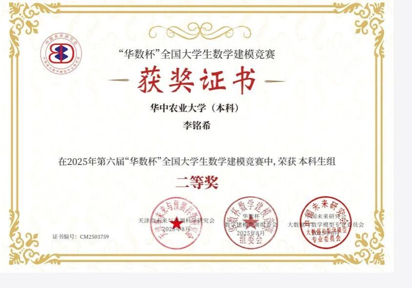 李铭希专注于学术探索,在科研与竞赛领域双向发力、硕果颇丰。她潜心钻研数学模型构建,凭借严谨的逻辑思维与扎实的理论功底,斩获“华数杯”全国大学生数学建模竞赛二等奖;科研道路上,她聚焦前沿、勇于创新,参与的研究成果不仅荣获校生物信息与技能竞赛二等奖,更成功被CCF-B类国际会议BIBM录用,得到国际会议的高度认可。此外,她紧扣数智化领域实际问题的发展趋势,参与ROS机器人数智融创跨学科创新训练项目的开发,在跨学科实践中锤炼着自己的综合能力;同时,她积极践行着知行合一的理念,投身于“挑战者杯”中“互联网+”教育栏目的“楚药慧识”科普项目,以多元科研实践积淀成长力量。