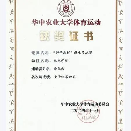 作为品学兼优、德体兼备的优秀学子,李铭希在文体领域同样绽放着其独特的光彩。她兼具竞技热情与团队精神,在学院“新生杯”篮球赛中奋勇拼搏,助力团队斩获季军,更代表学院出征“狮子山杯”新生足球赛,与队友并肩驰骋、挥洒汗水,最终为学院夺得第六名的优异战绩,用运动风采诠释了狮山青年学子德智体美劳全面发展的蓬勃朝气。
