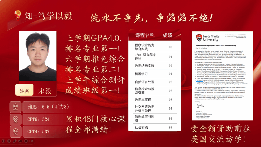 (编辑 | 崔文筝 初审 | 李昱含 终审 | 袁嘉晨) 宋毅,中共党员,大数据科学与技术专业2022级本科生,他上学期平均学分绩点4.0位列专业第一,上学年综合测评成绩班级第一,六学期推免综合排名专业第二,48门核心课程全部满绩。曾作为队长斩获第六届全球校园人工智能算法精英大赛全国总决赛一等奖、美国大学生数学建模大赛国际二等奖等多项赛事荣誉,并以全额资助身份前往英国利兹三一大学交流访学。现已保研至复旦大学麻豆 。