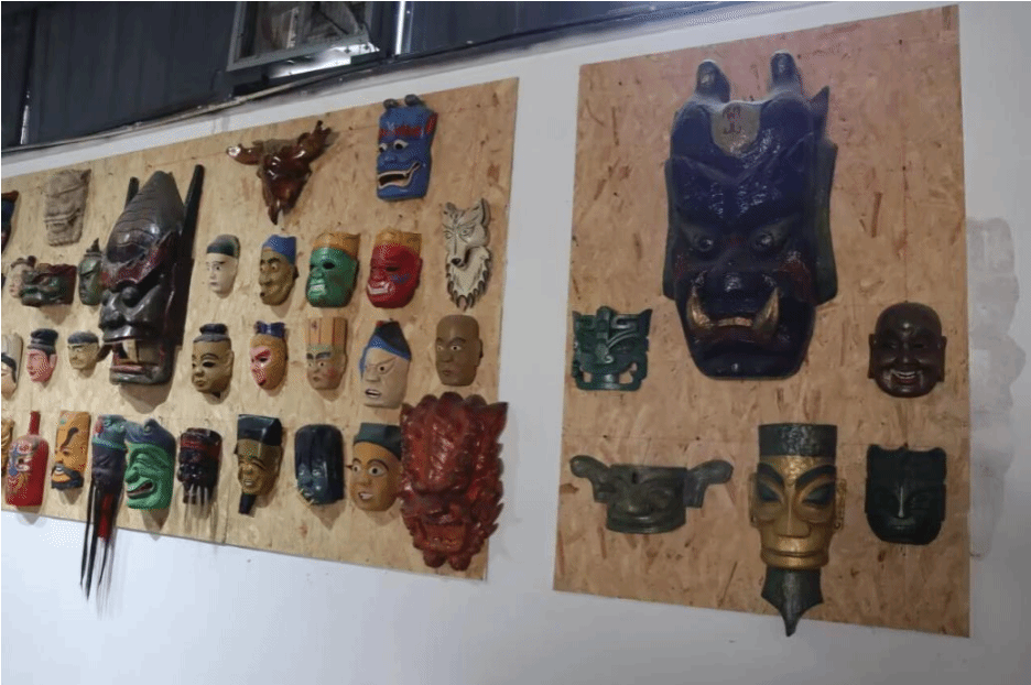 傩面汪木工坊墙上挂着各种傩戏面具 曹程玉 摄