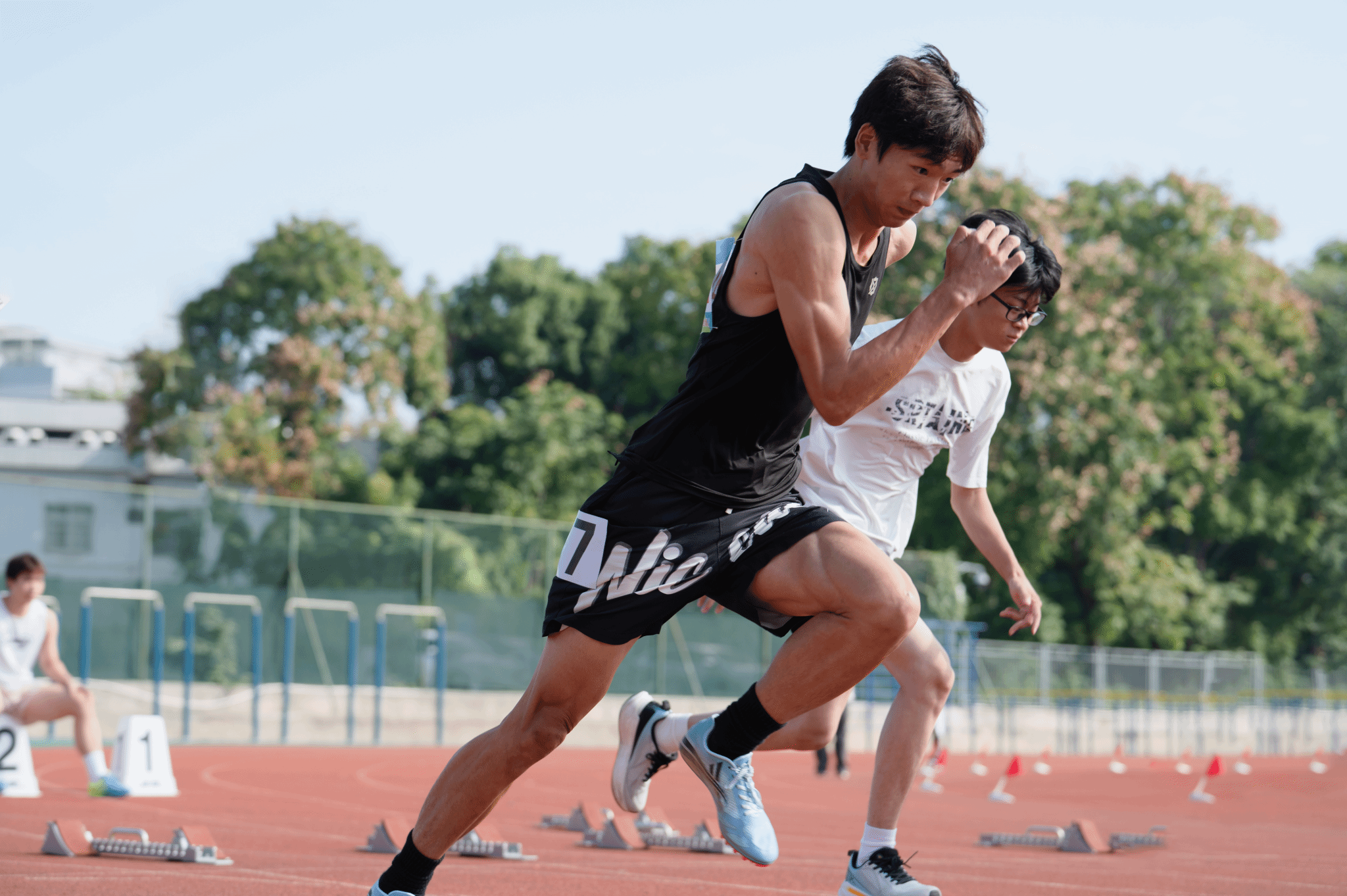 100米决赛里,田杰如离弦之箭,在直道上掀起“信息速度”,获得男子组100米第一名。