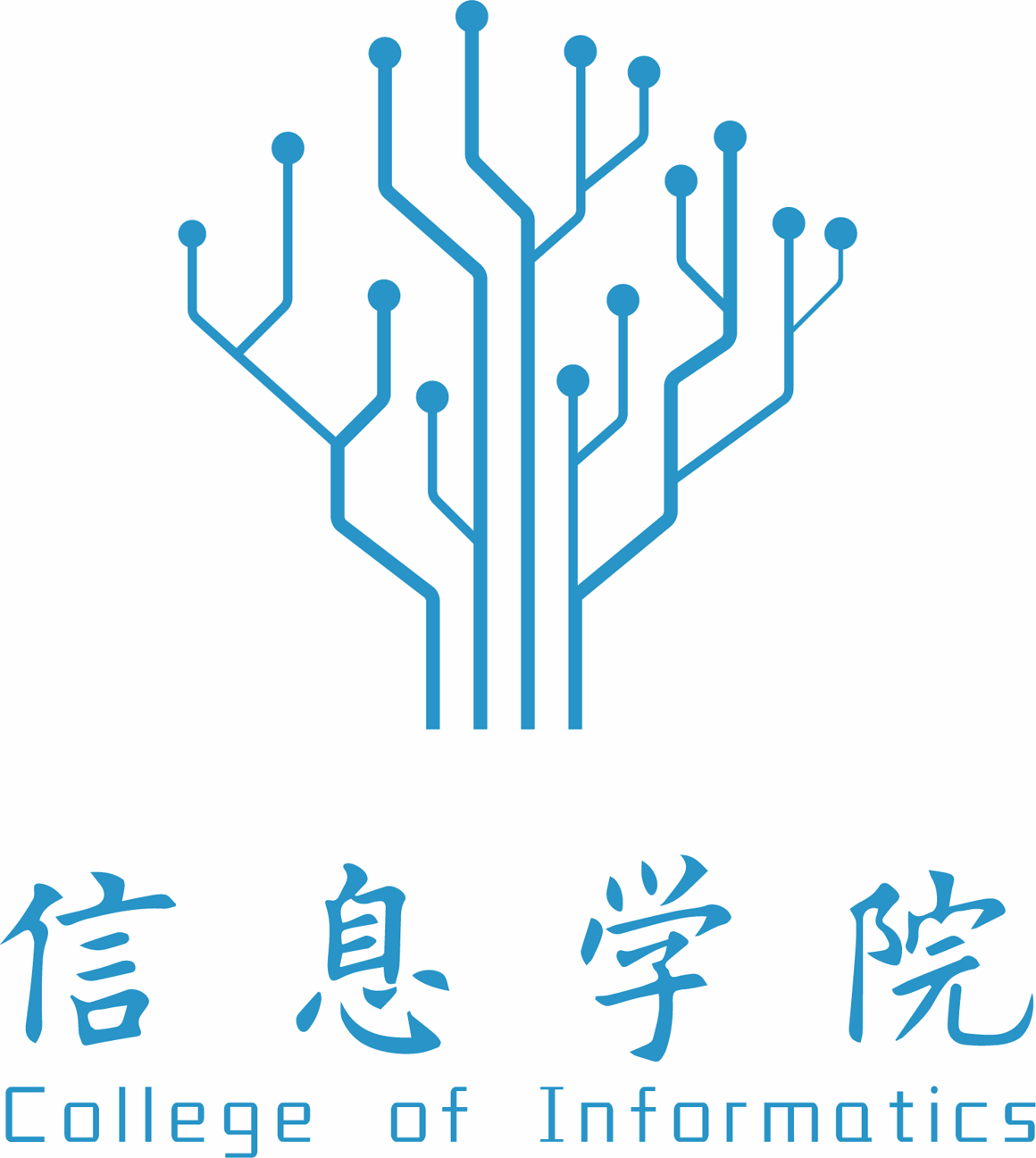 学院标志选用蓝色作为设计颜色,从informatics这一单词中提取出“i”作为基本元素。无数“i”组成一棵呈现向上发展趋势的信息树。图形整体以麻豆 数、理、化、生四大基础学科作为主干,向上拓展和延伸出无数信息枝蔓,寓意麻豆 蓬勃向上、枝繁叶茂、硕果累累。主体造型既像代表农业行业的植物,又像体现信息特色的电路板。
